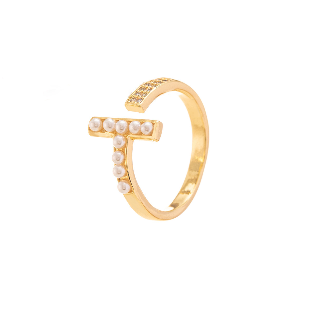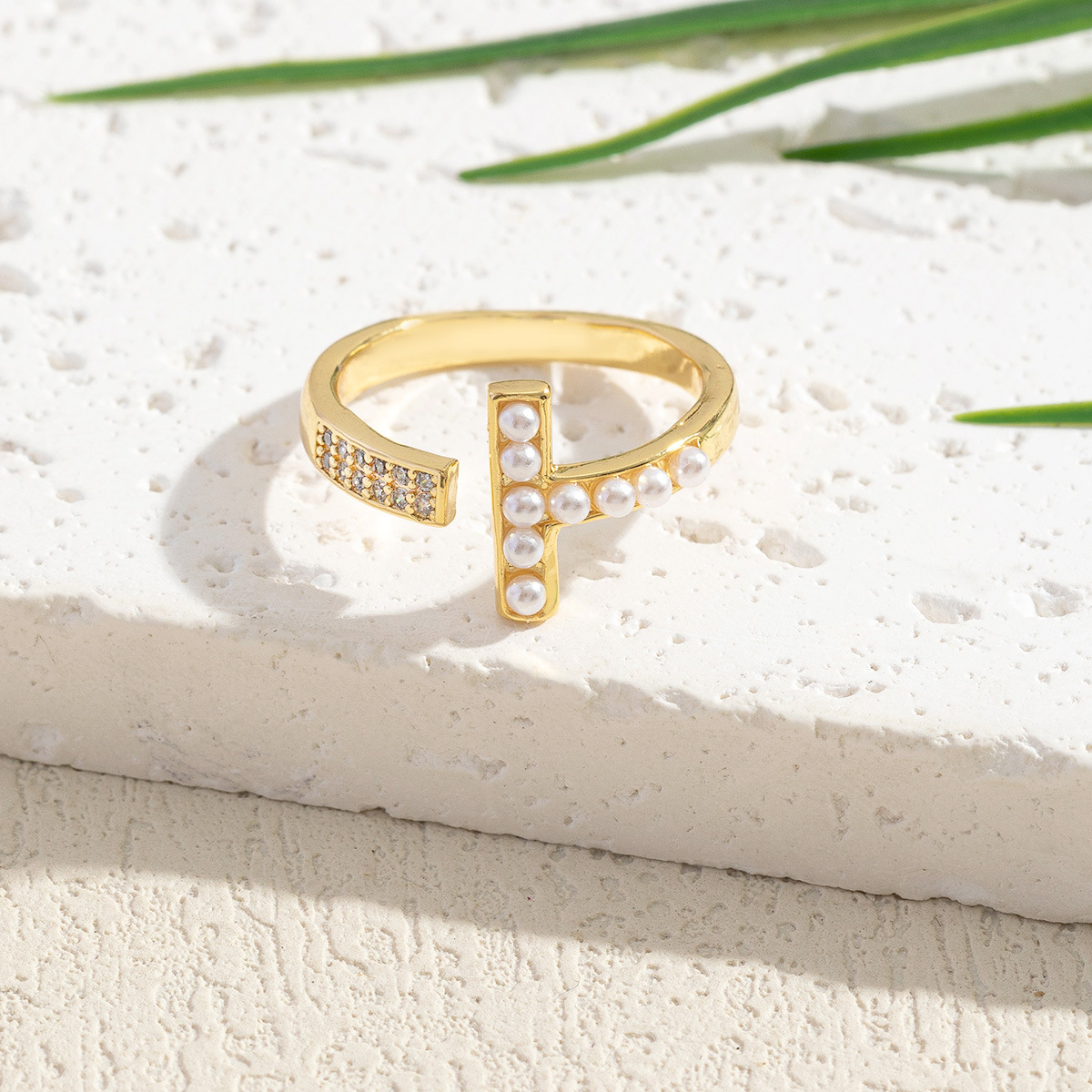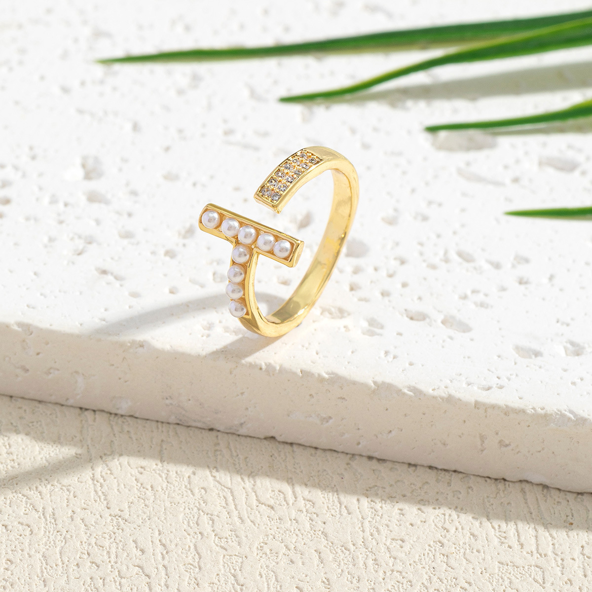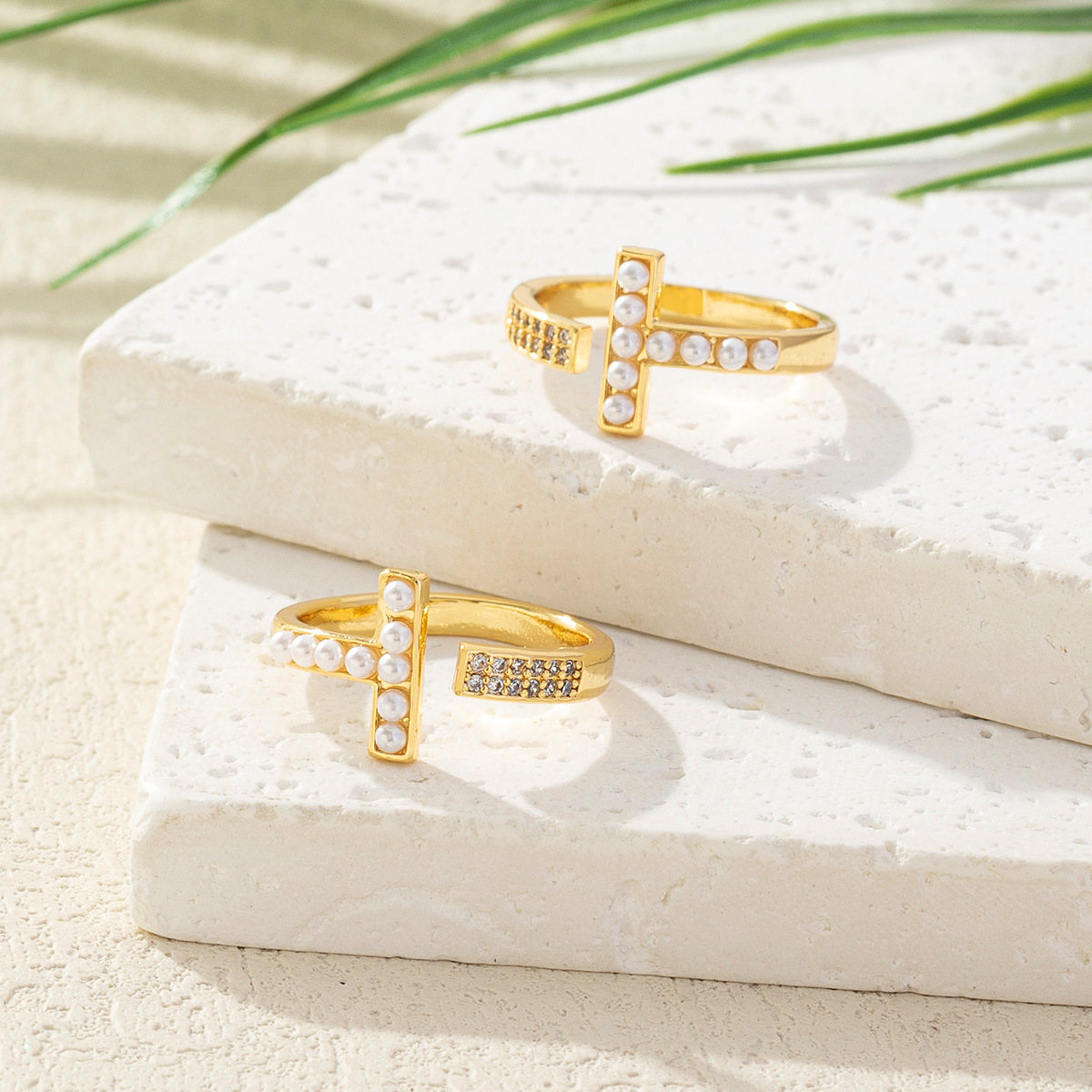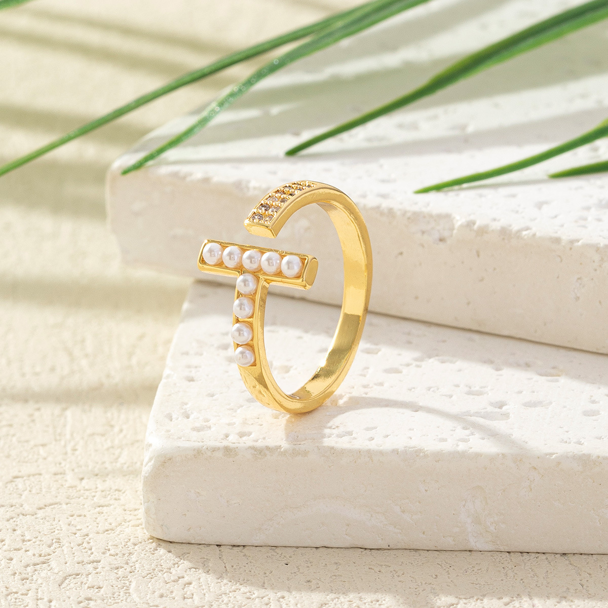 【真金电镀】韩国简约几何珍珠微镶轻奢冷淡风小众T形开口戒指【环保】