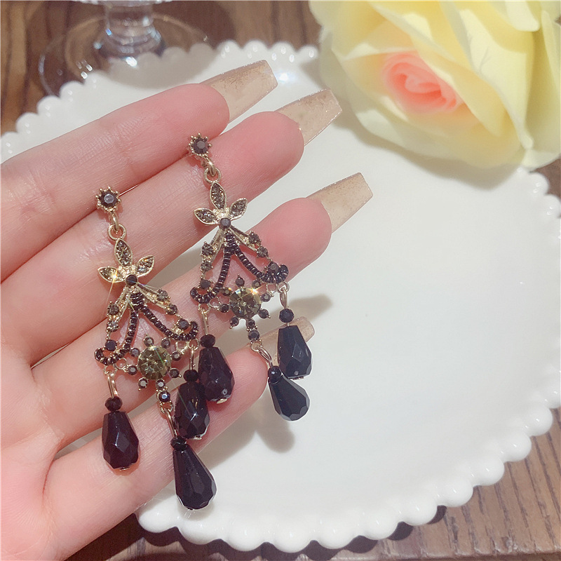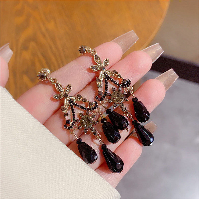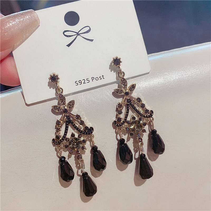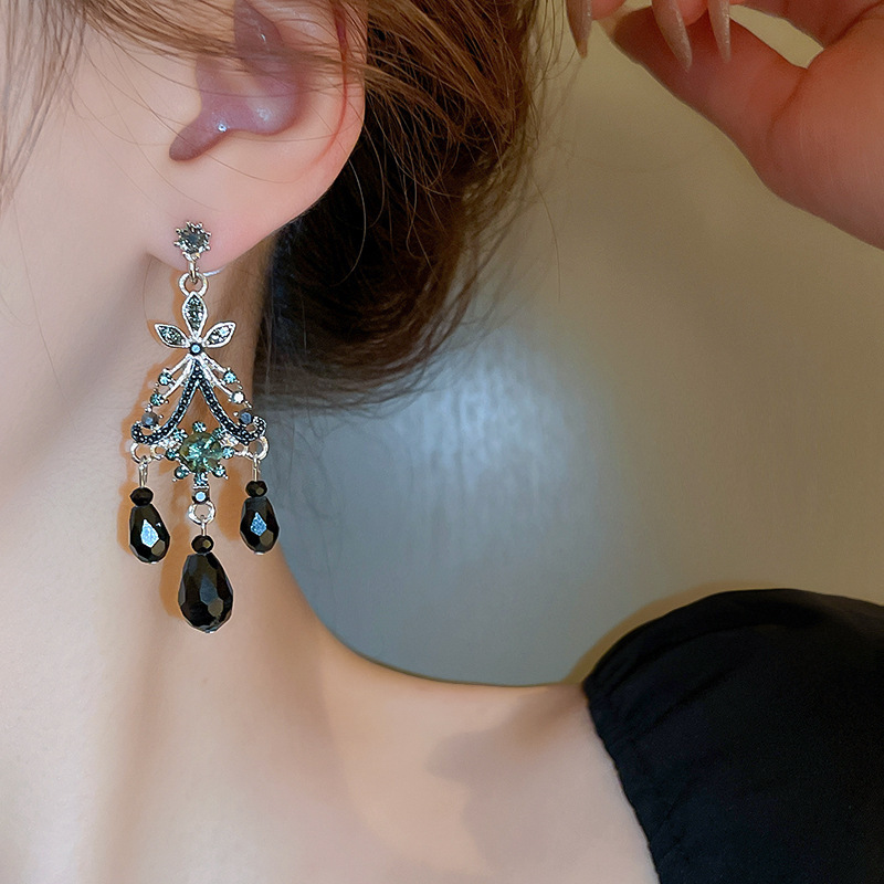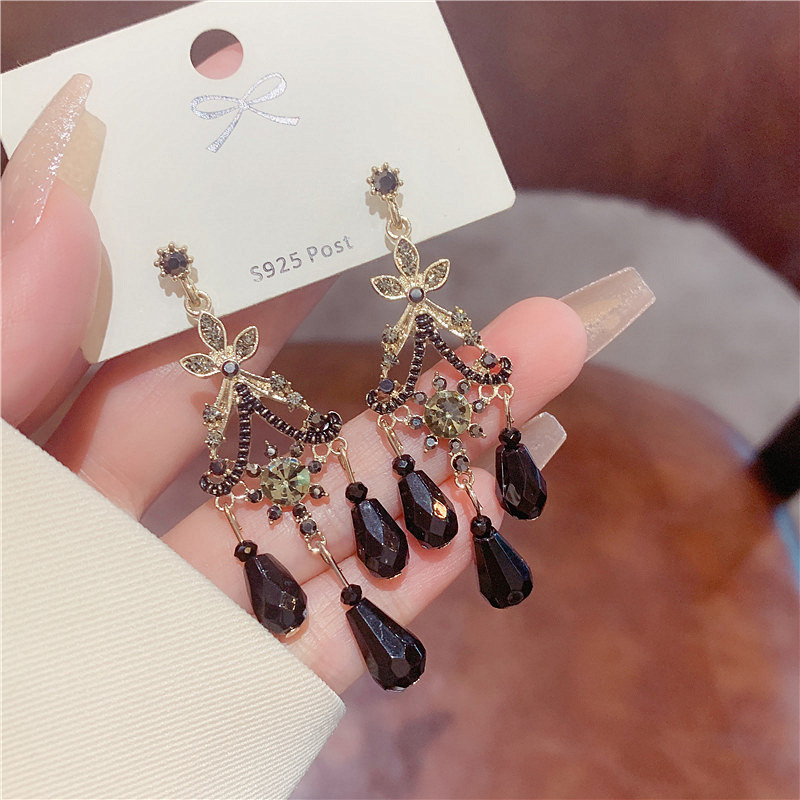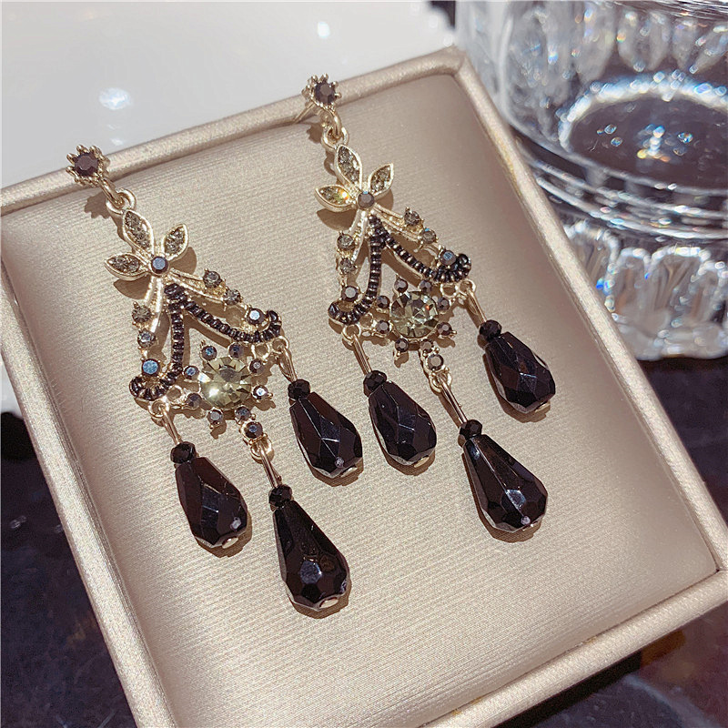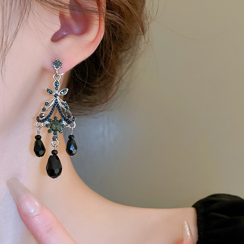 复古宫廷风黑色水晶耳环女小众设计流苏高级感长款耳坠