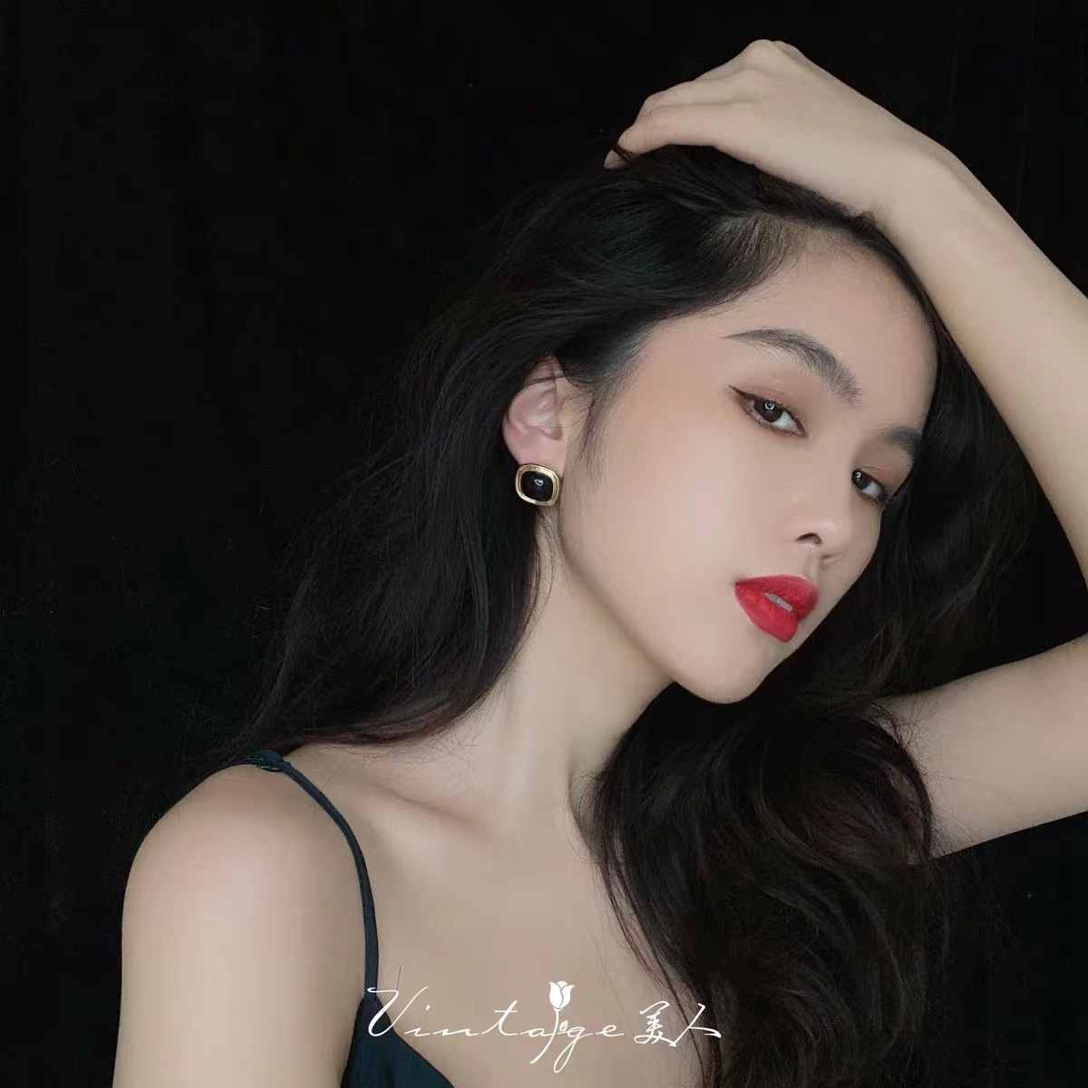 复古港风黑色小方块设计高级耳钉网红气质显脸瘦耳环年新款潮