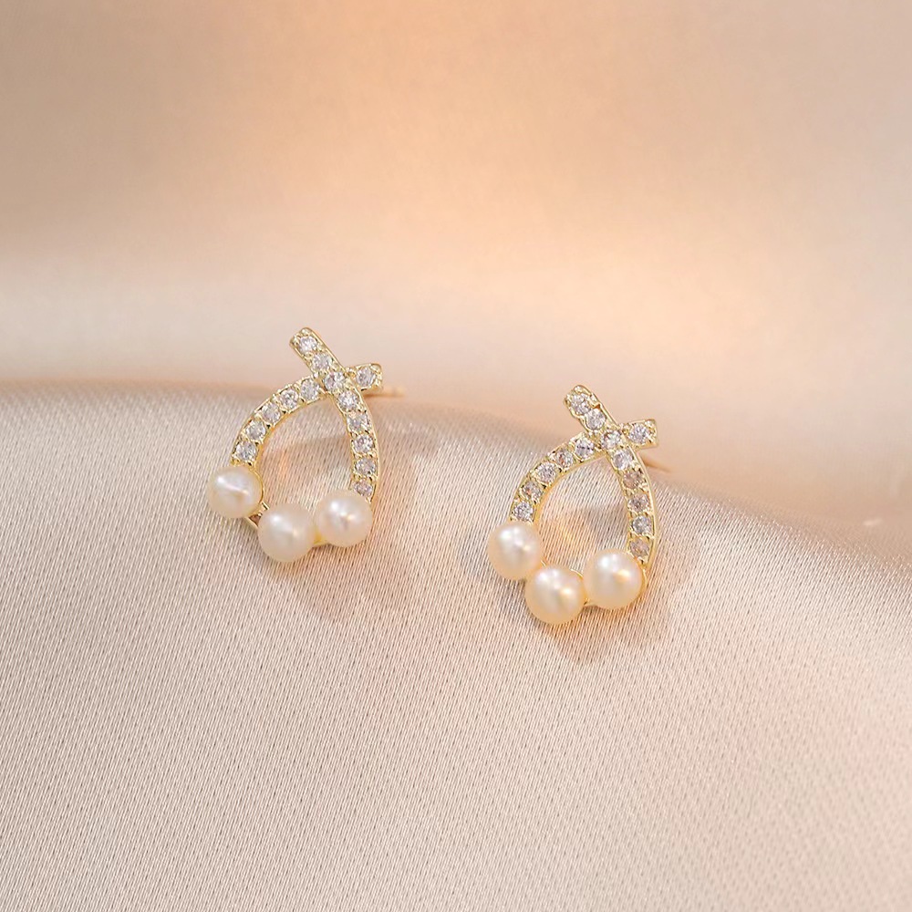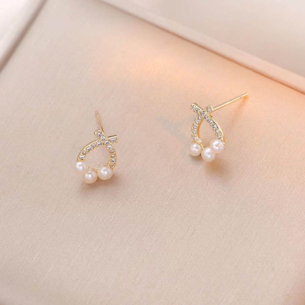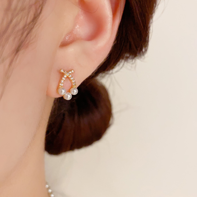 韩国简约气质珍珠耳钉小巧交叉满钻耳饰日常百搭新款2024耳环女
