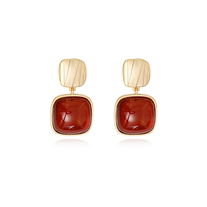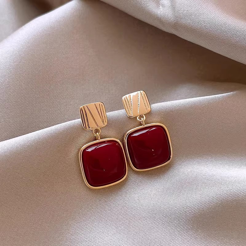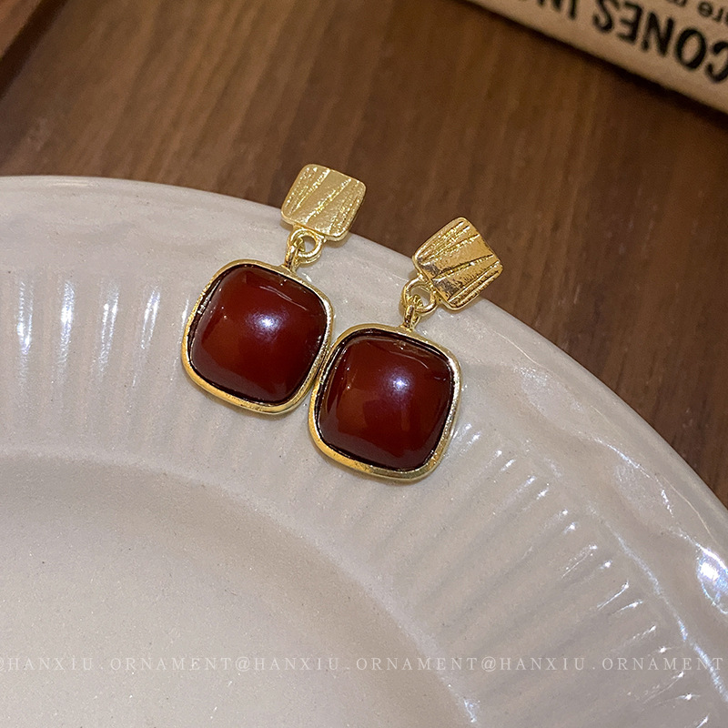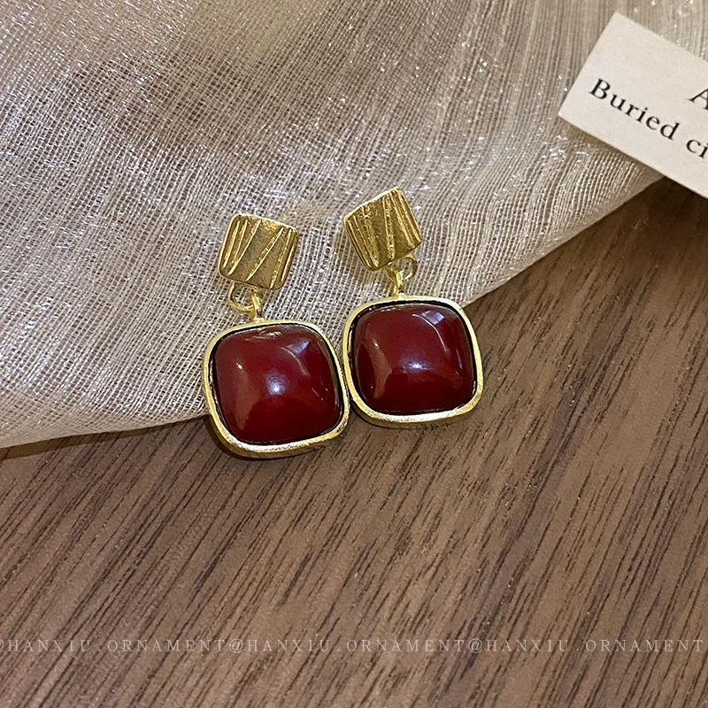 韩国轻奢高级感气质耳环新款复古朱砂小众精致耳饰品几何方块耳钉女