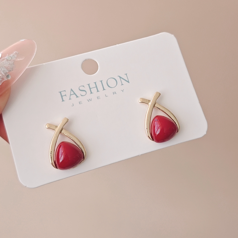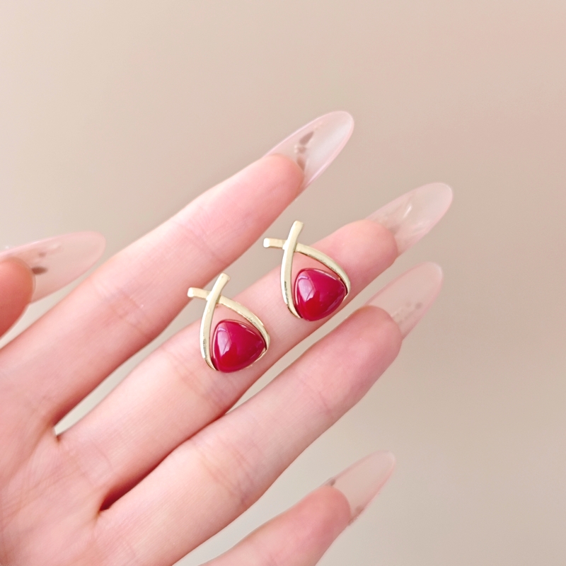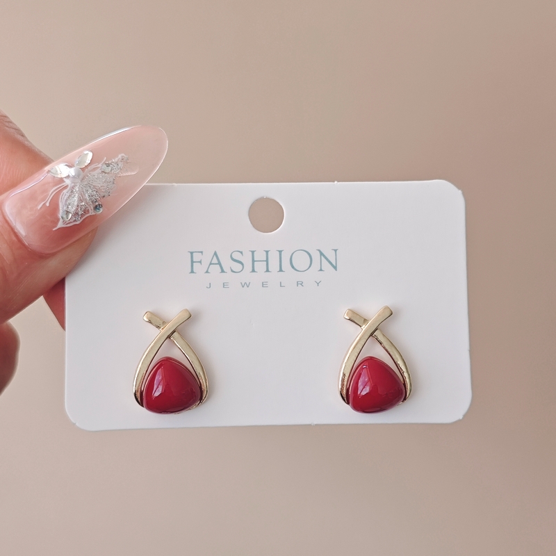 韩国金属感交叉珍珠耳环高级安可拉红色耳饰轻奢小众耳坠耳钉女