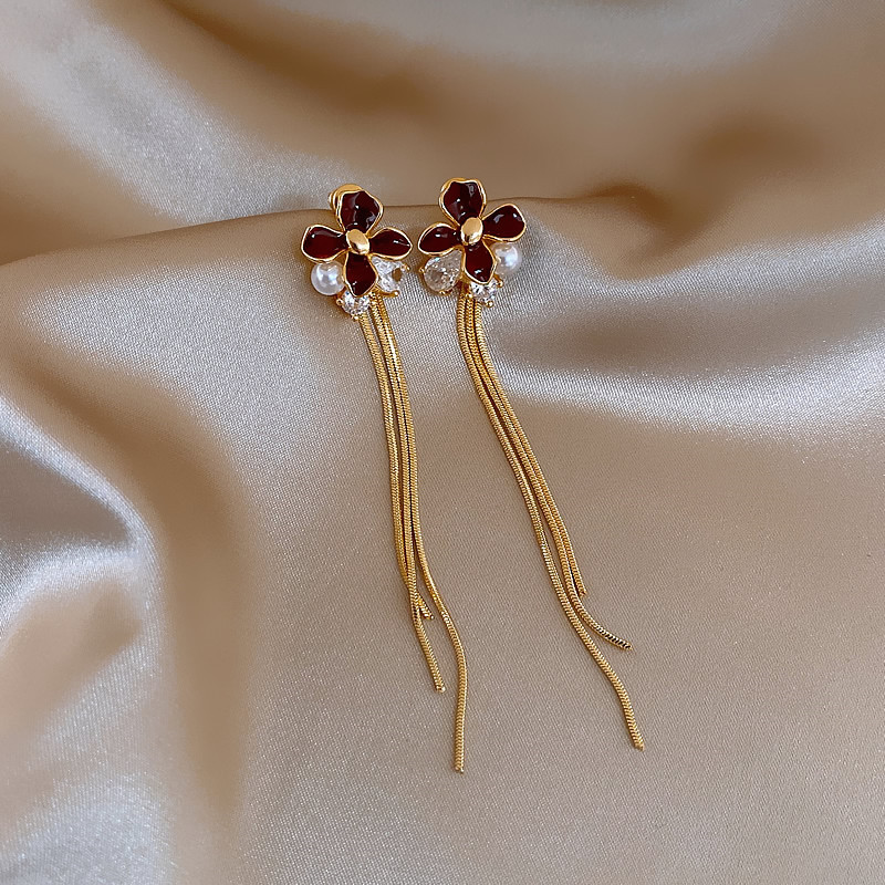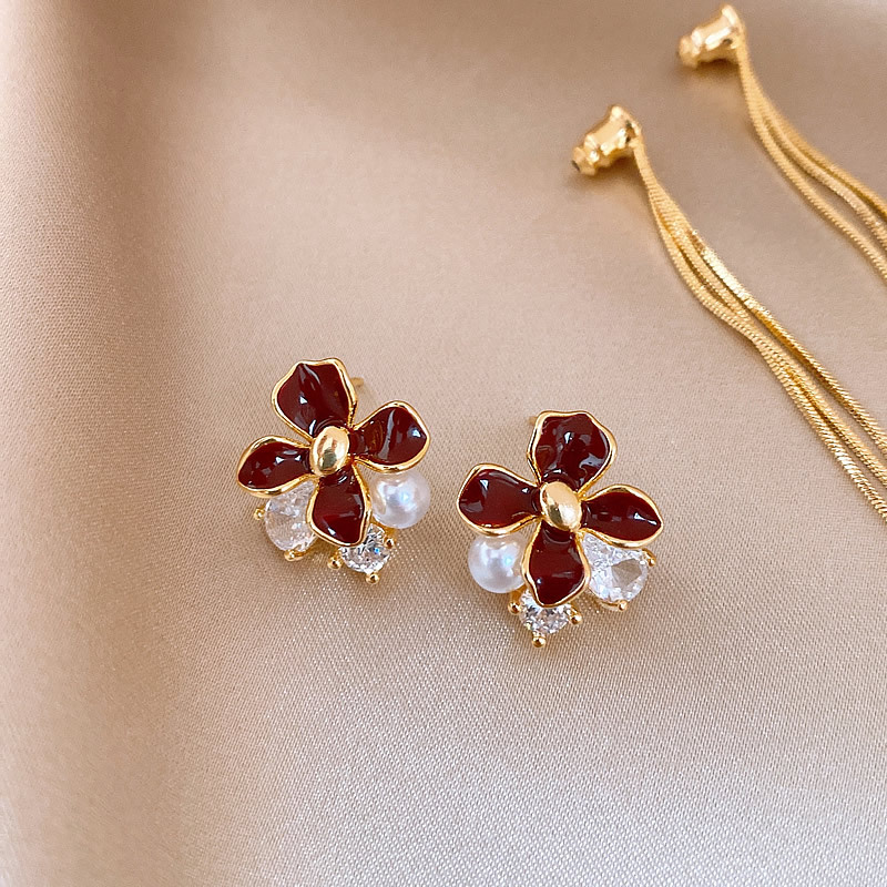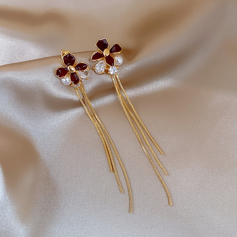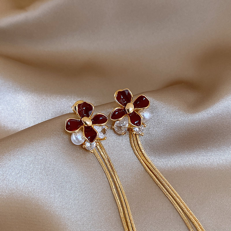 韩国红色滴油花朵珍珠流苏耳钉小众耳环女轻奢高级感耳饰