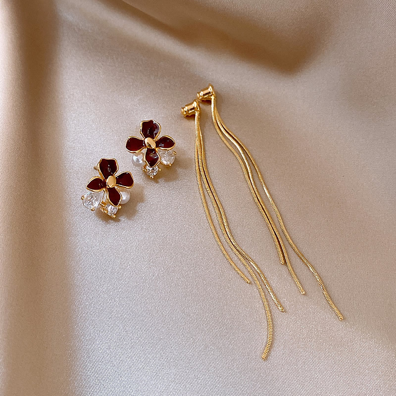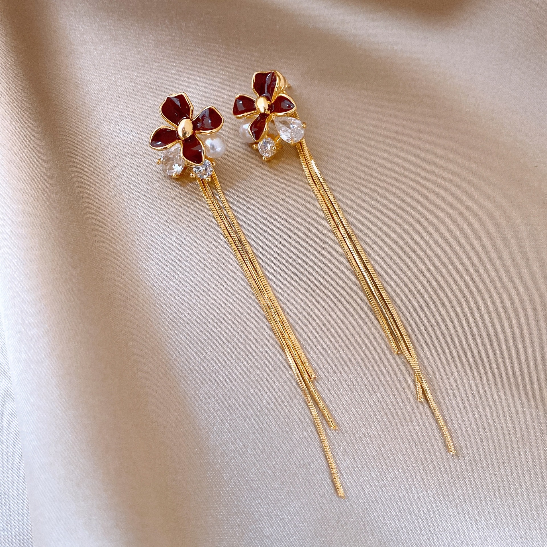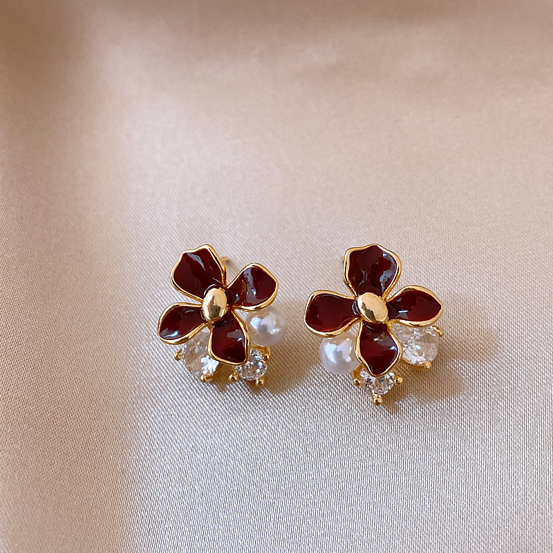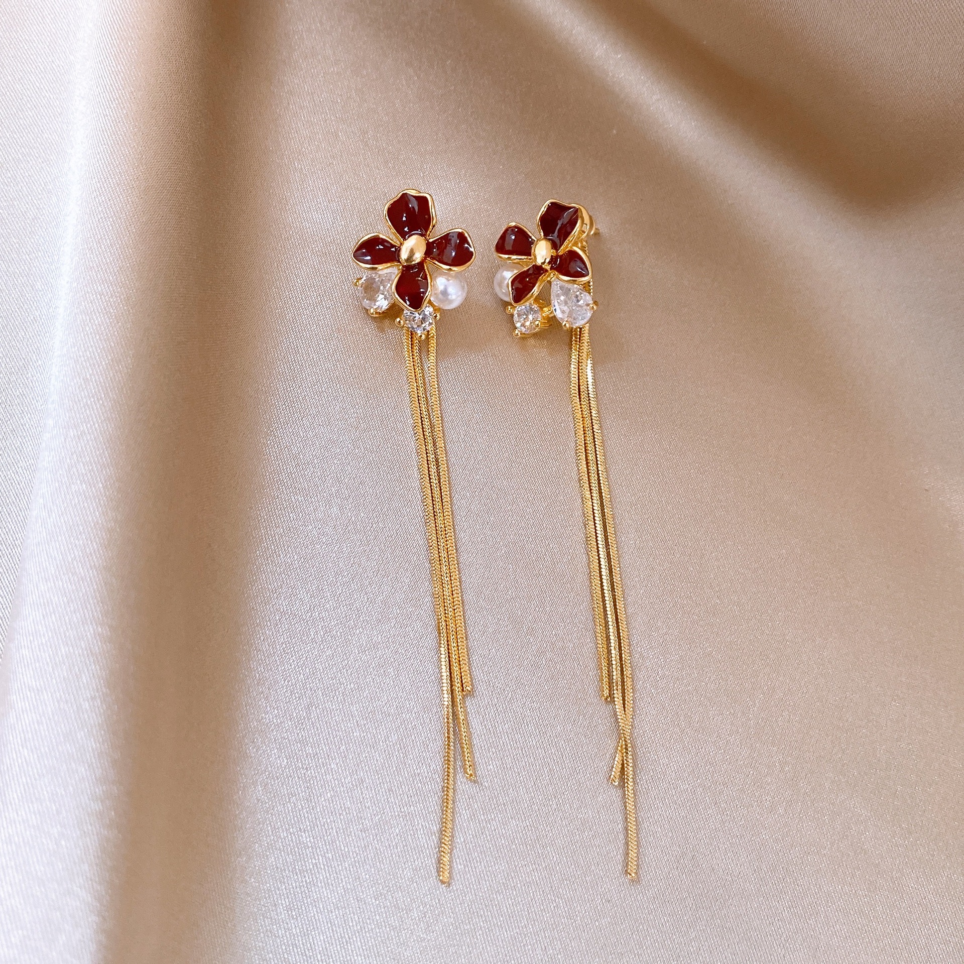 韩国红色滴油花朵珍珠流苏耳钉小众耳环女轻奢高级感耳饰