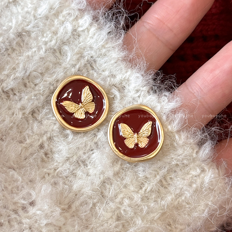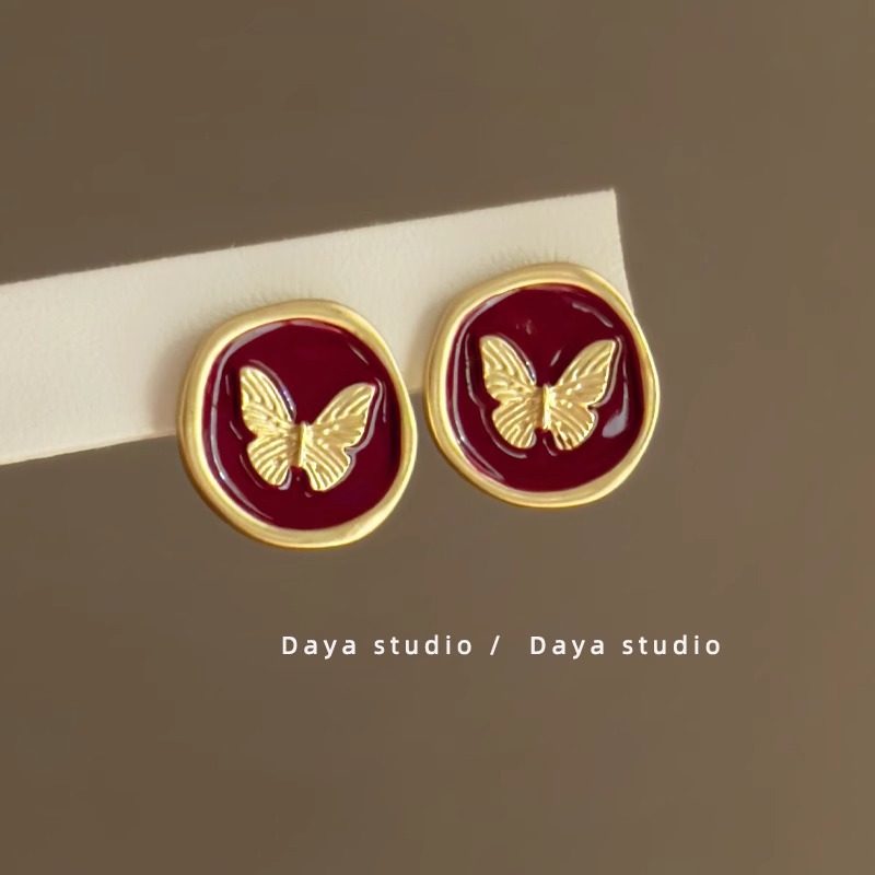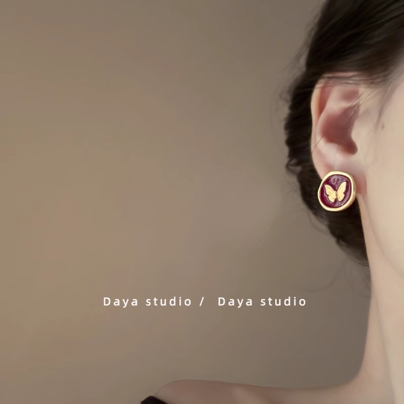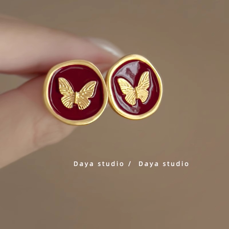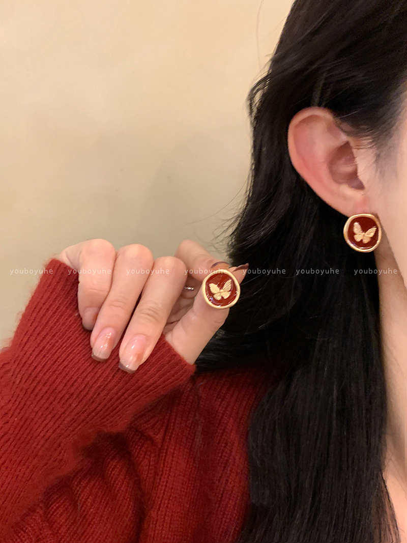韩国复古轻奢红色滴油耳钉女设计感时尚气质红色蝴蝶百搭耳环耳饰女