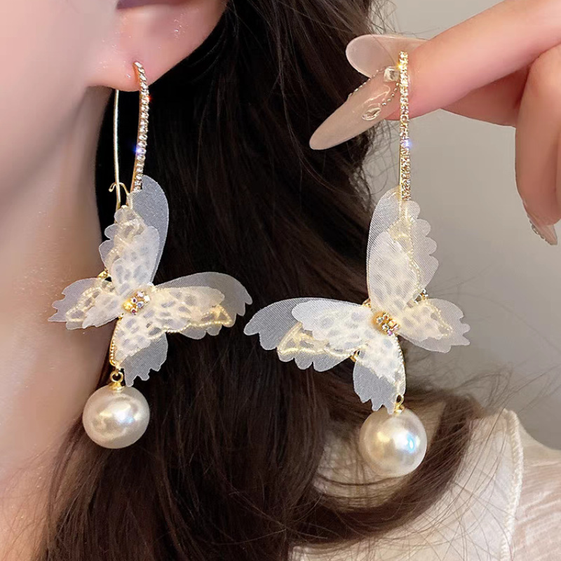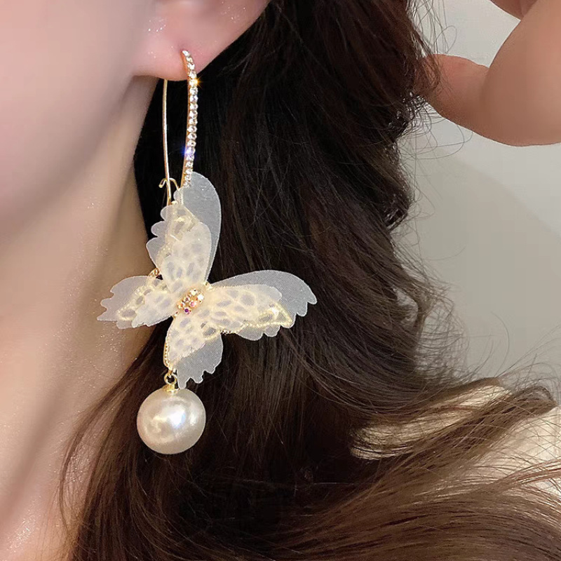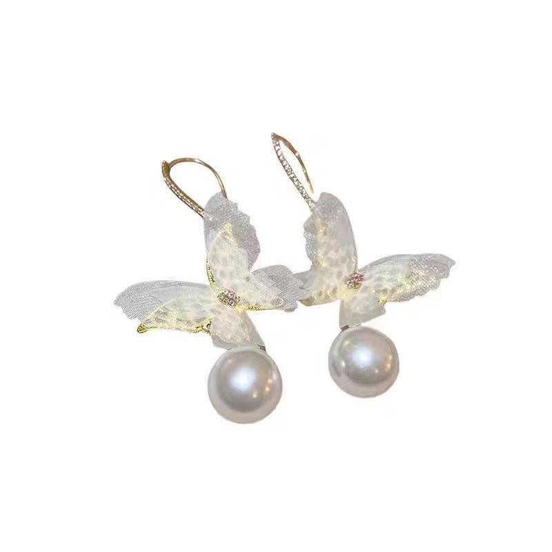 法式浪漫超仙薄纱耳环镶钻镂空网纱蝴蝶珍珠耳钩个性夸张高级耳饰