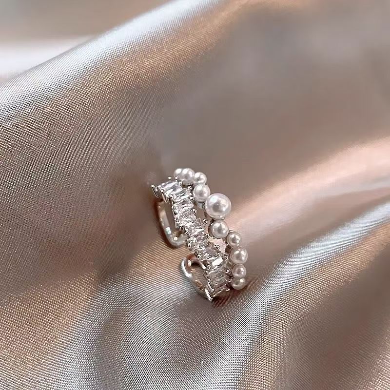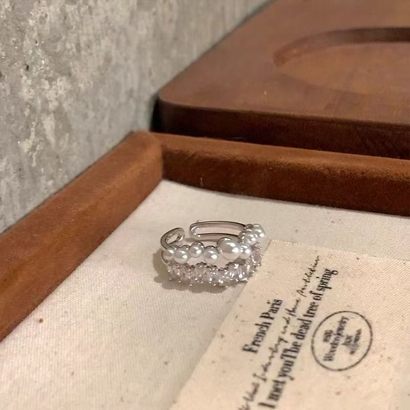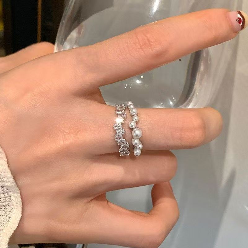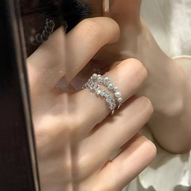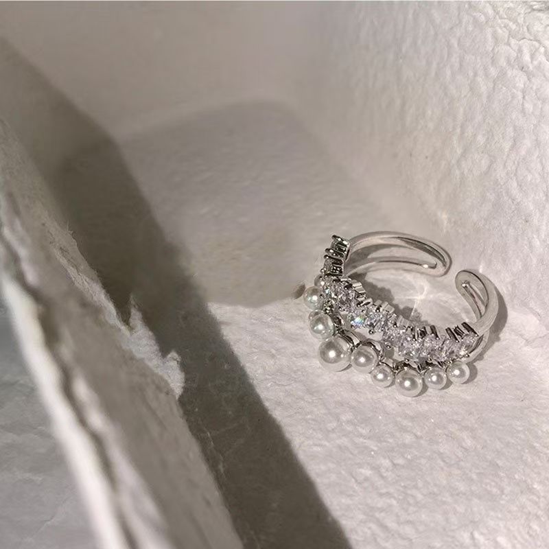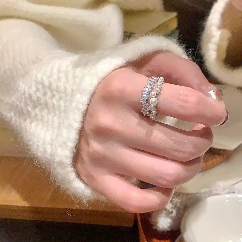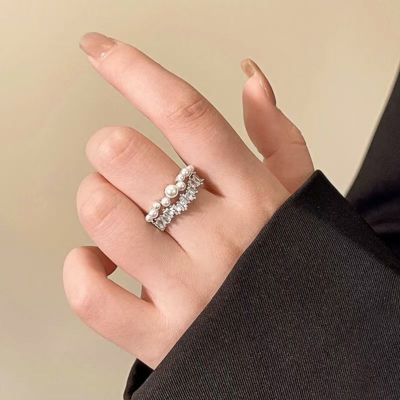 韩国·精致显手白珍珠锆石开口戒指轻奢小众气质高级感食指戒