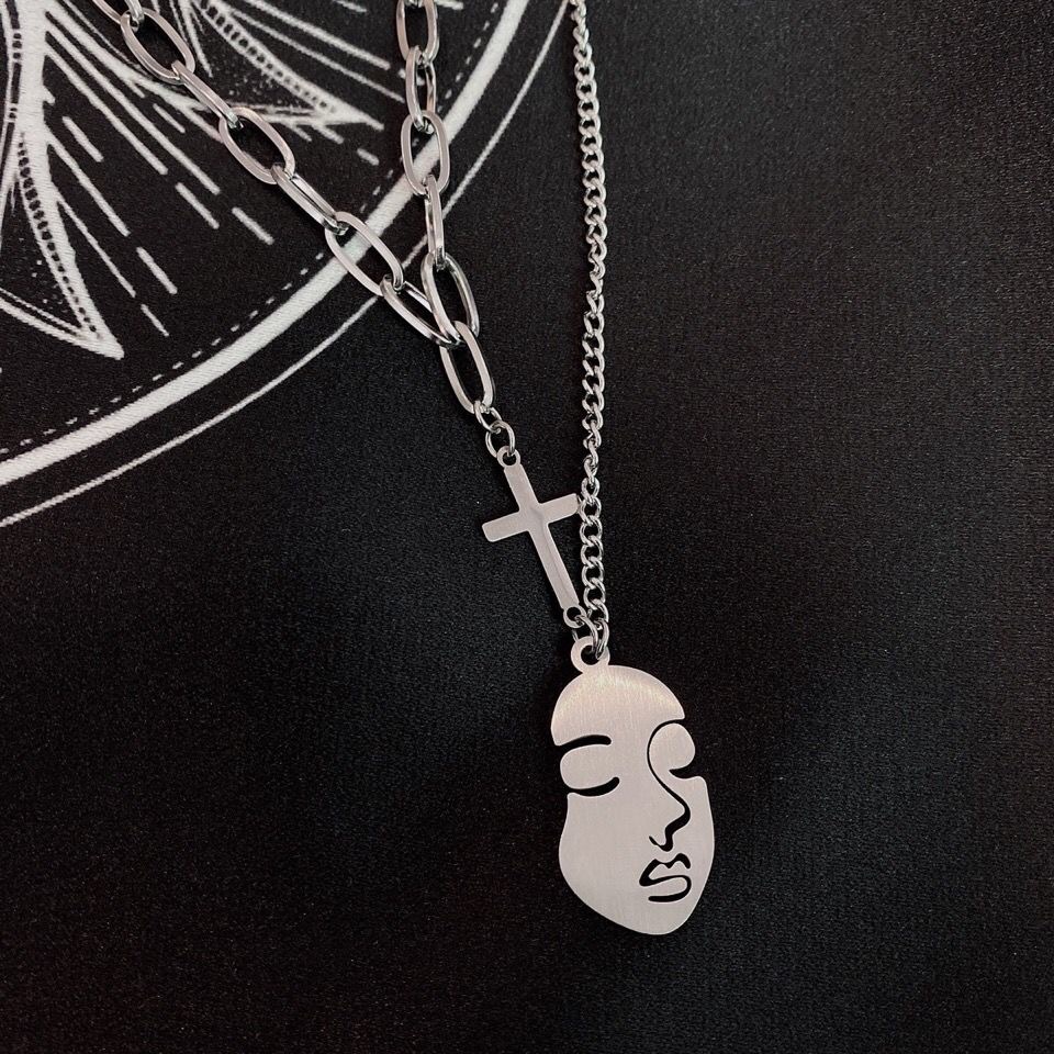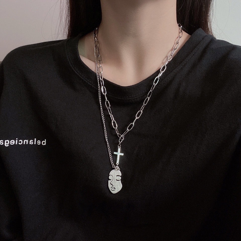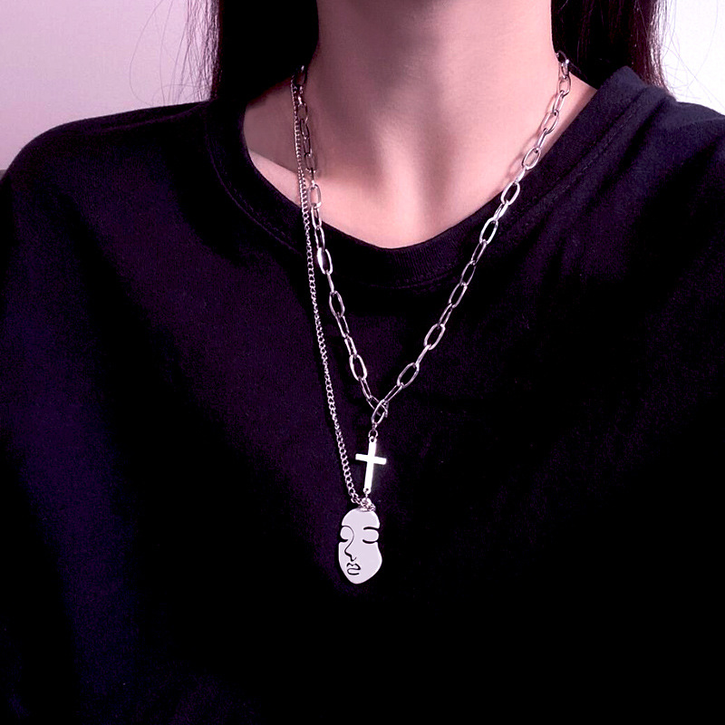 @特价ins欧美潮牌人脸吊坠男女双层项链情侣十字架冷淡风情侣项链