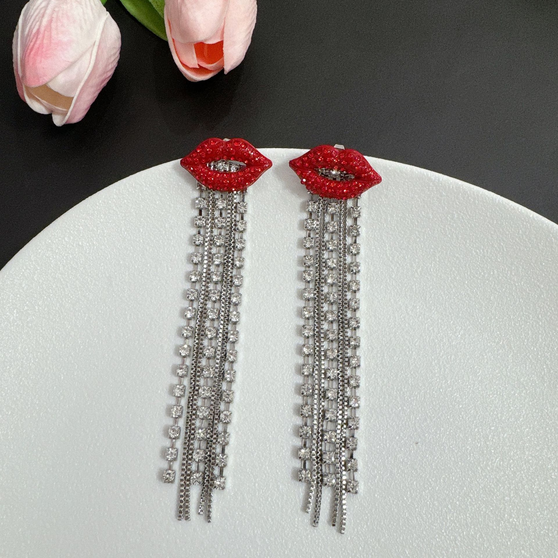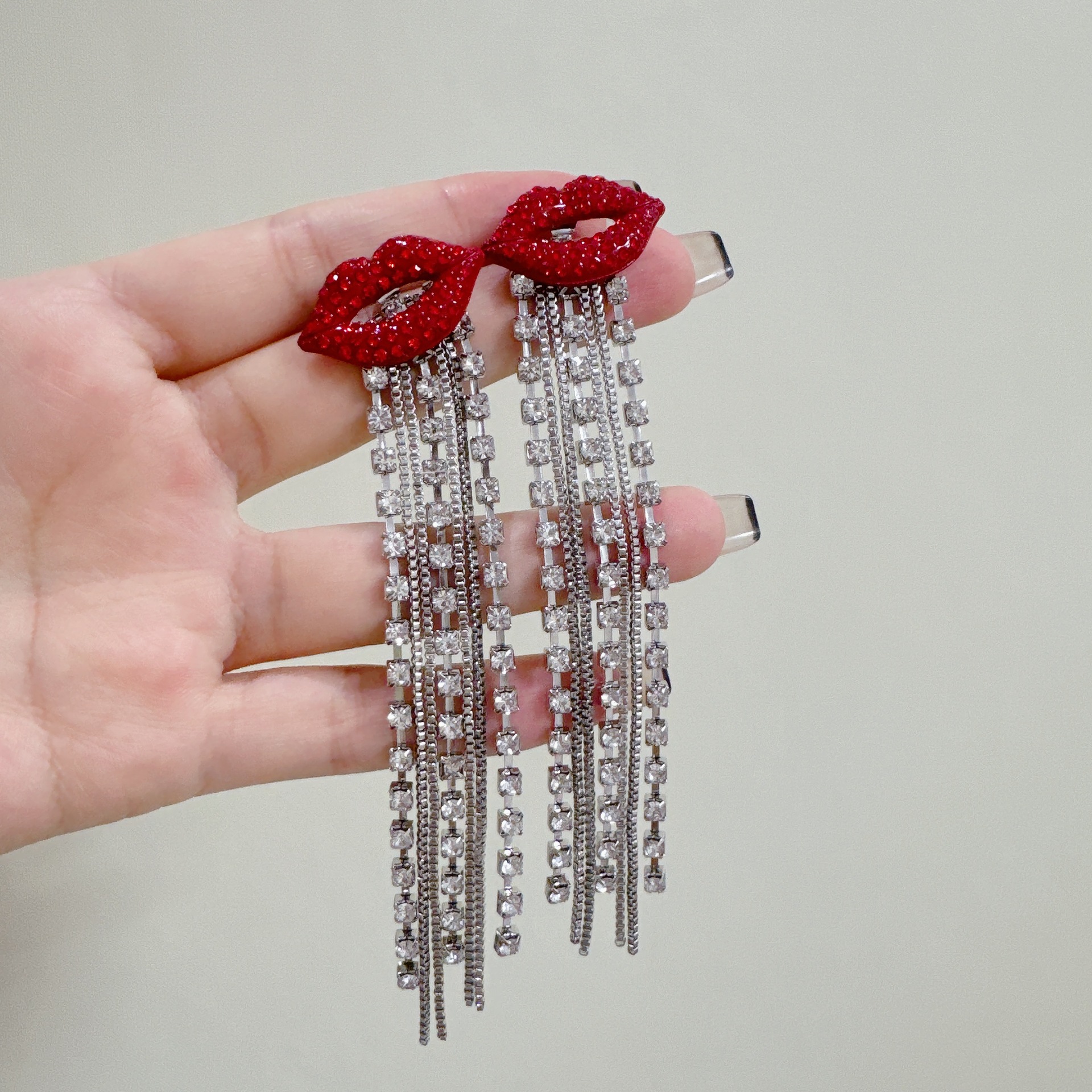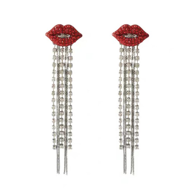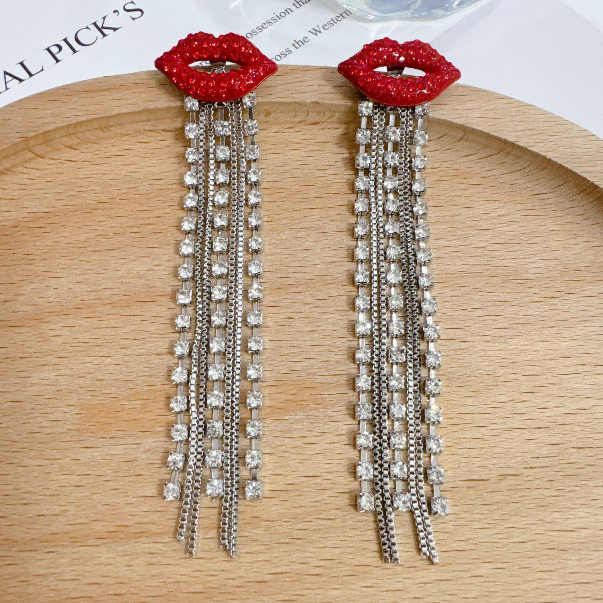欧美烈焰红唇夸张银针性感耳钉气质镶钻圆脸显瘦长款流苏耳坠