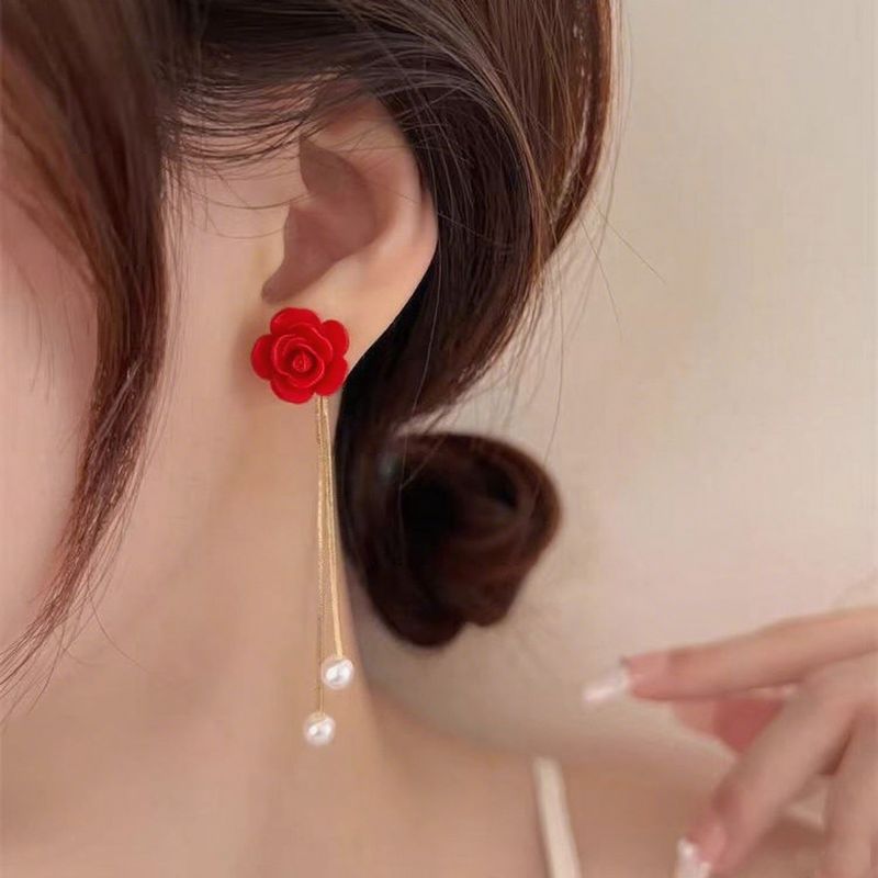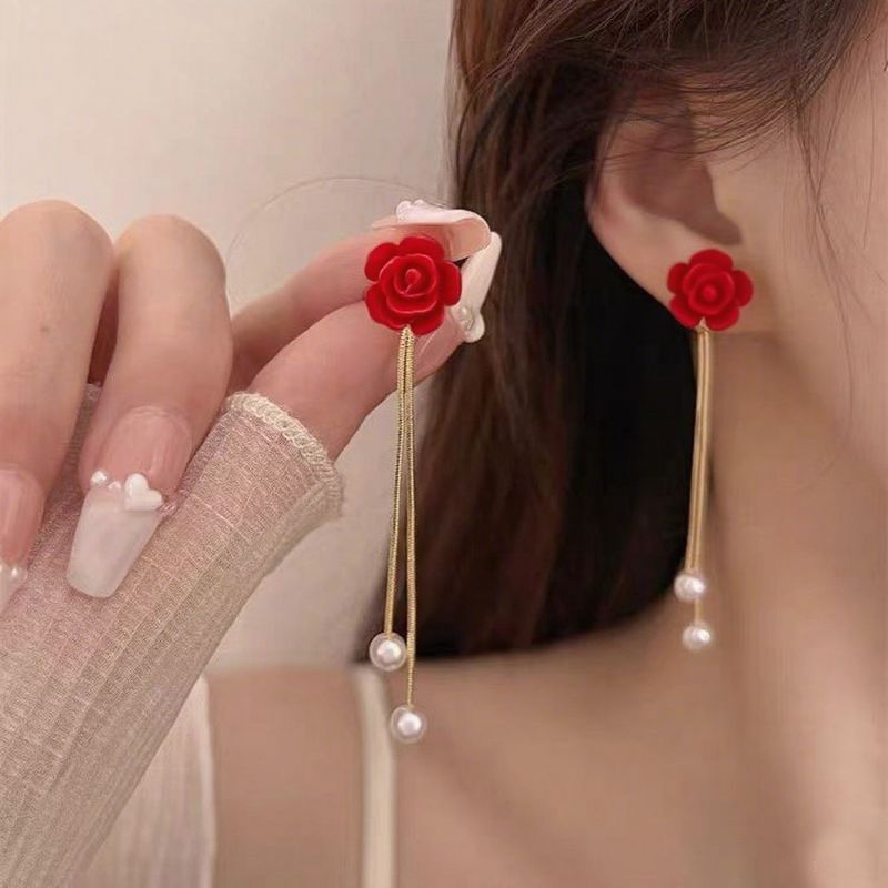 红色山茶花流苏耳环女时尚小众气质高级轻奢爆款耳钉耳饰品