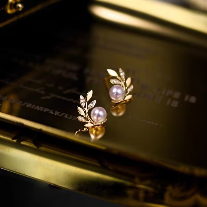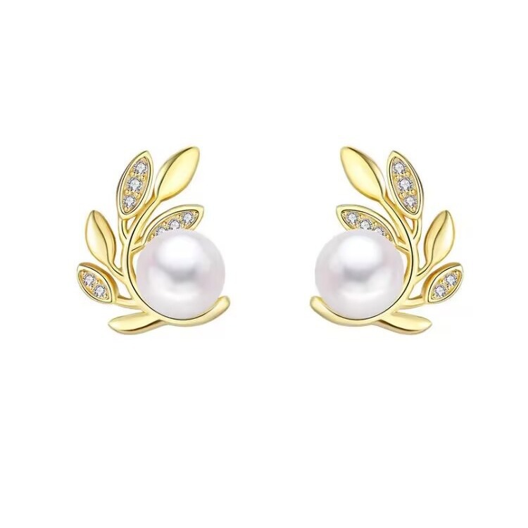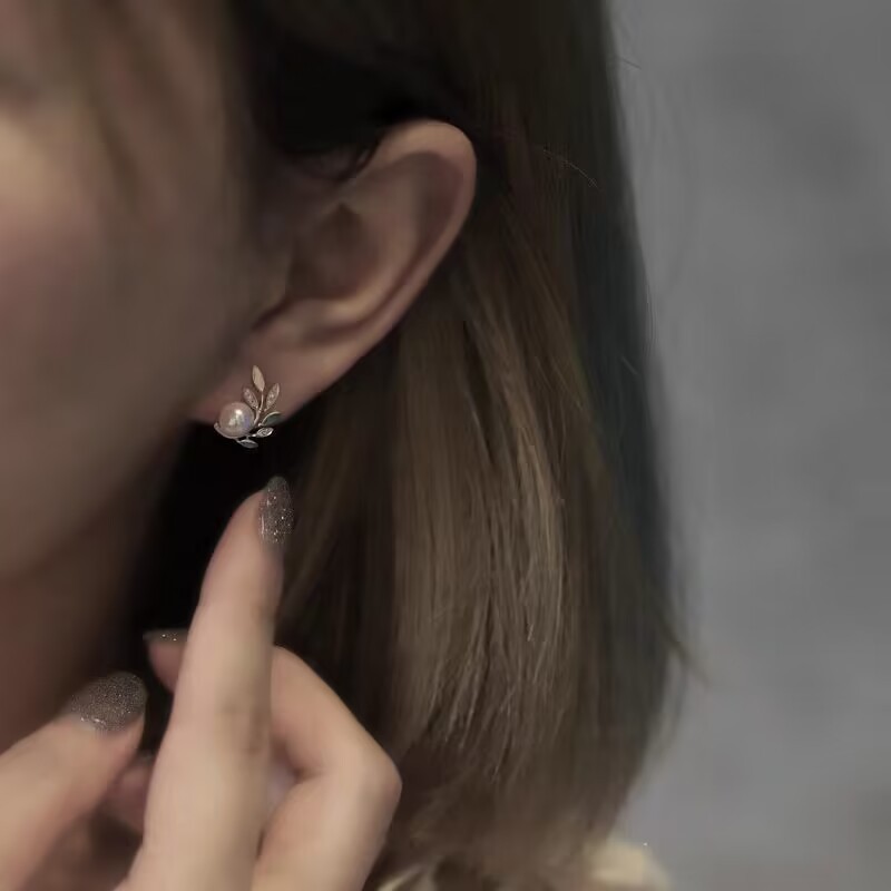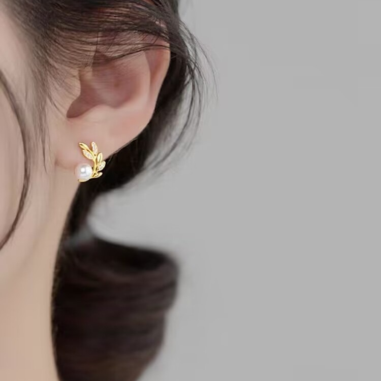 高级感小众珍珠树枝叶子耳钉女法式轻奢气质百搭耳环复古冷淡耳饰