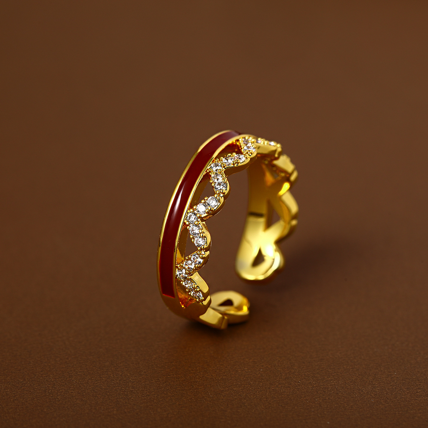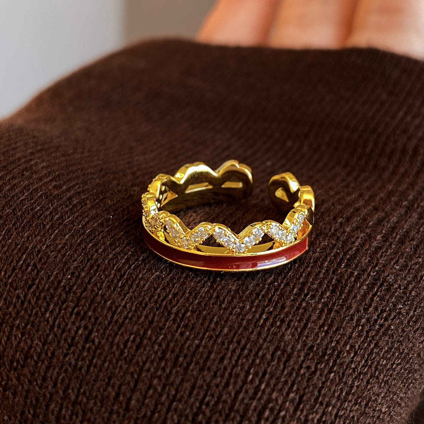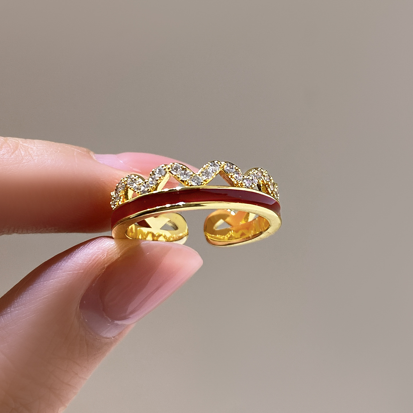 秋冬金色锆石红色波浪开口戒指女复古轻奢高级感食指戒小众配饰品