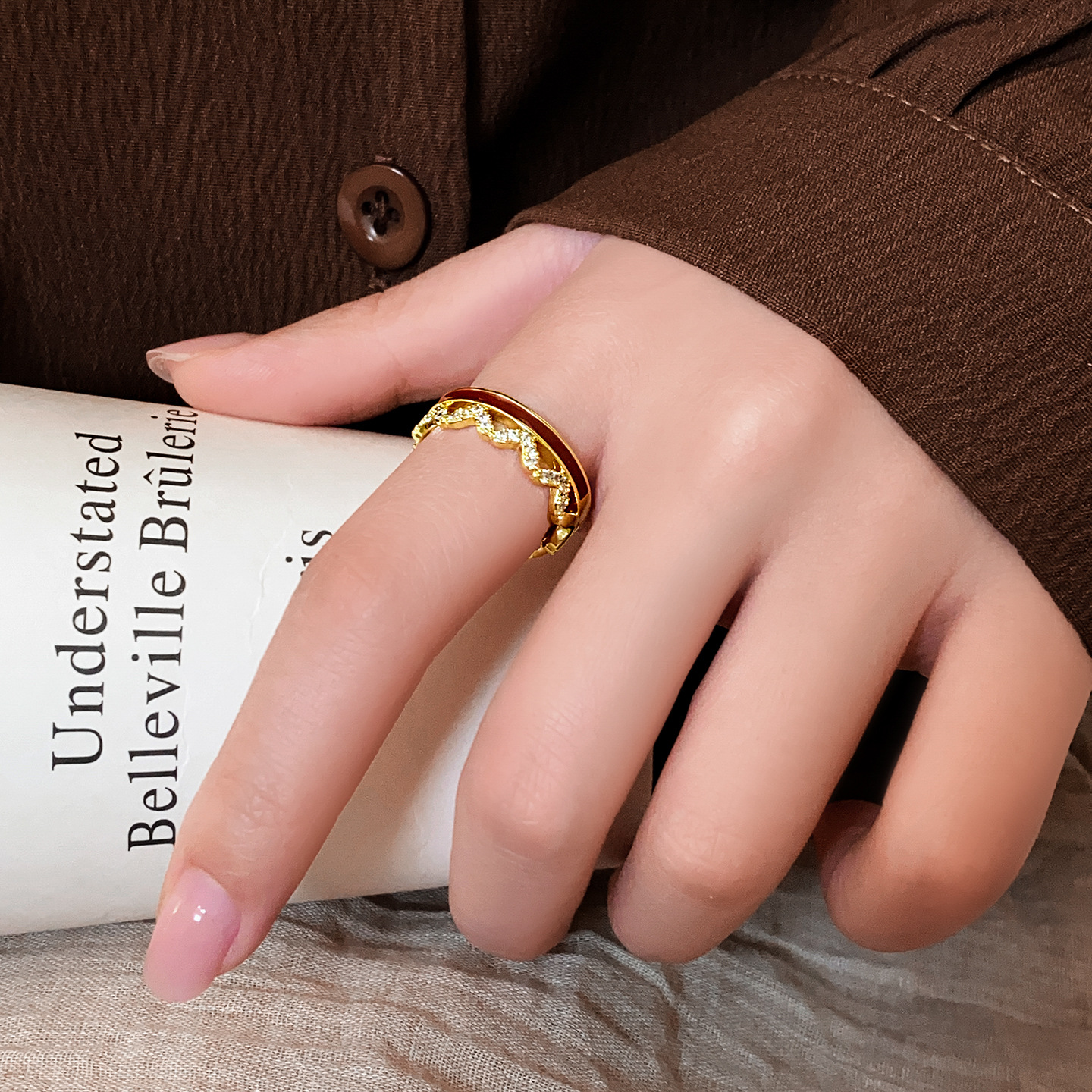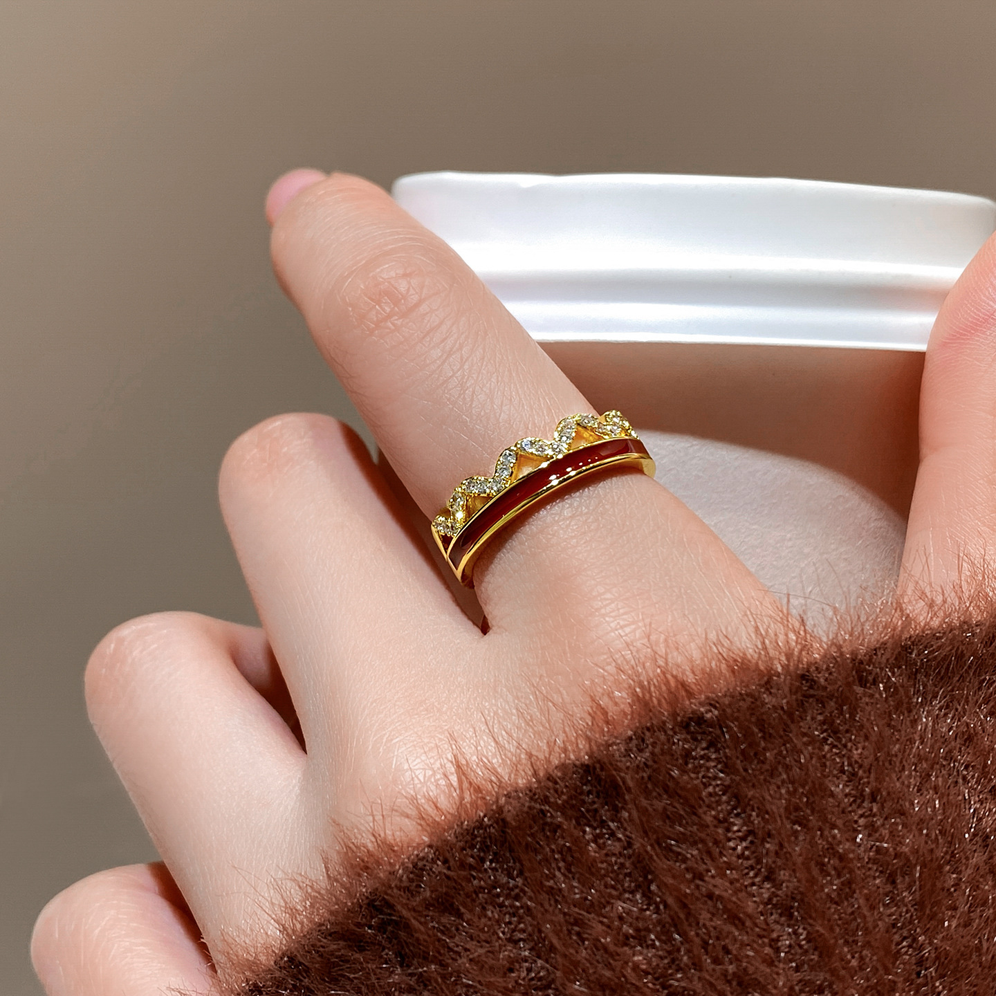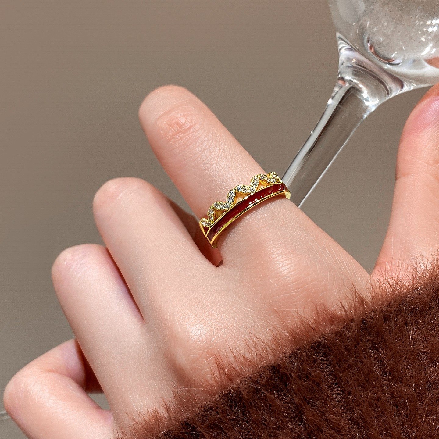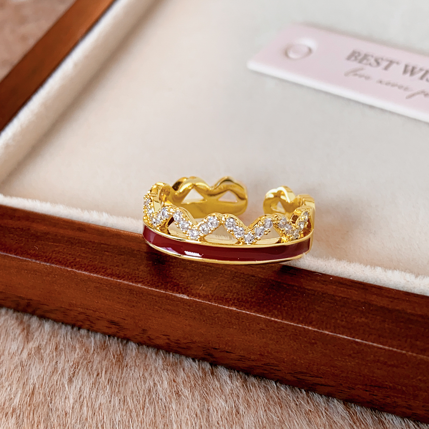 秋冬金色锆石红色波浪开口戒指女复古轻奢高级感食指戒小众配饰品