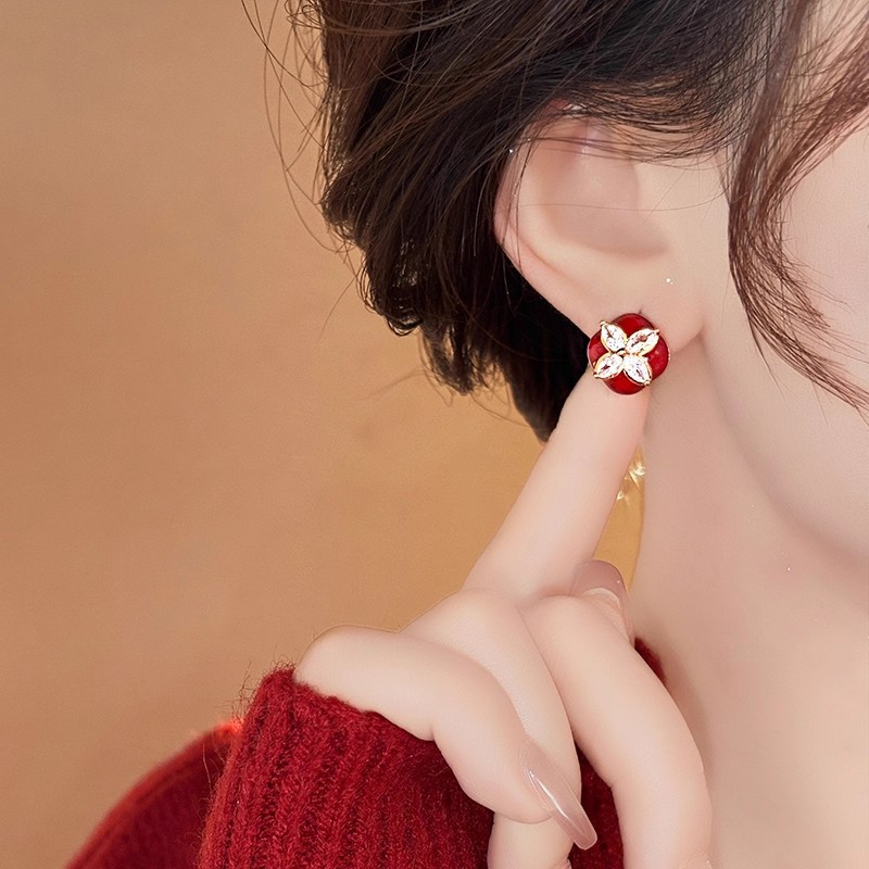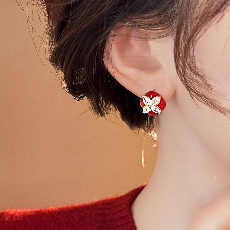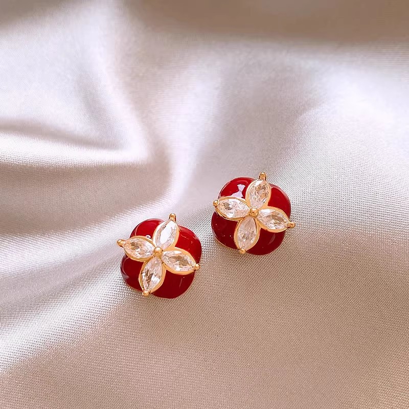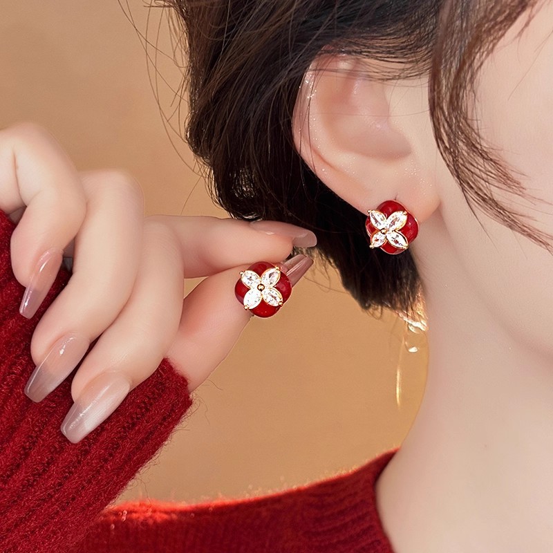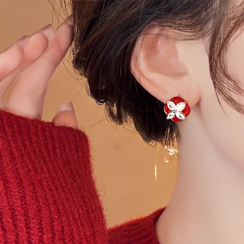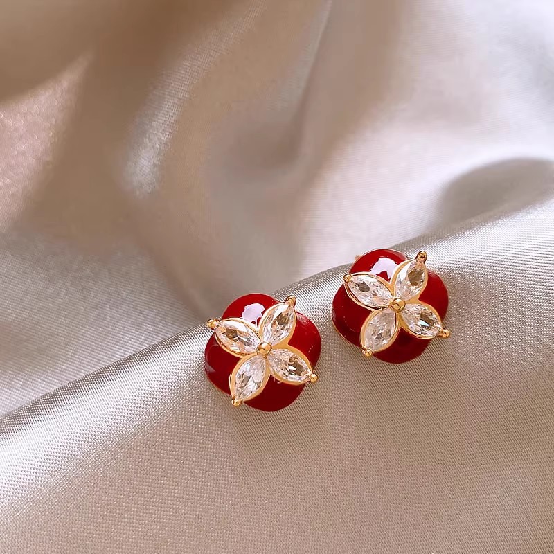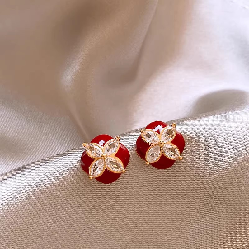韩国个性红色滴油耳钉气质优雅名媛风耳环锆石四叶草百搭耳饰