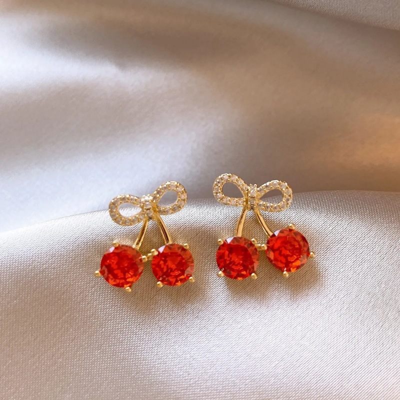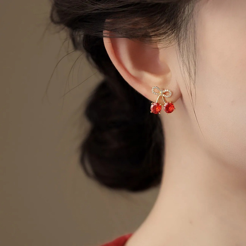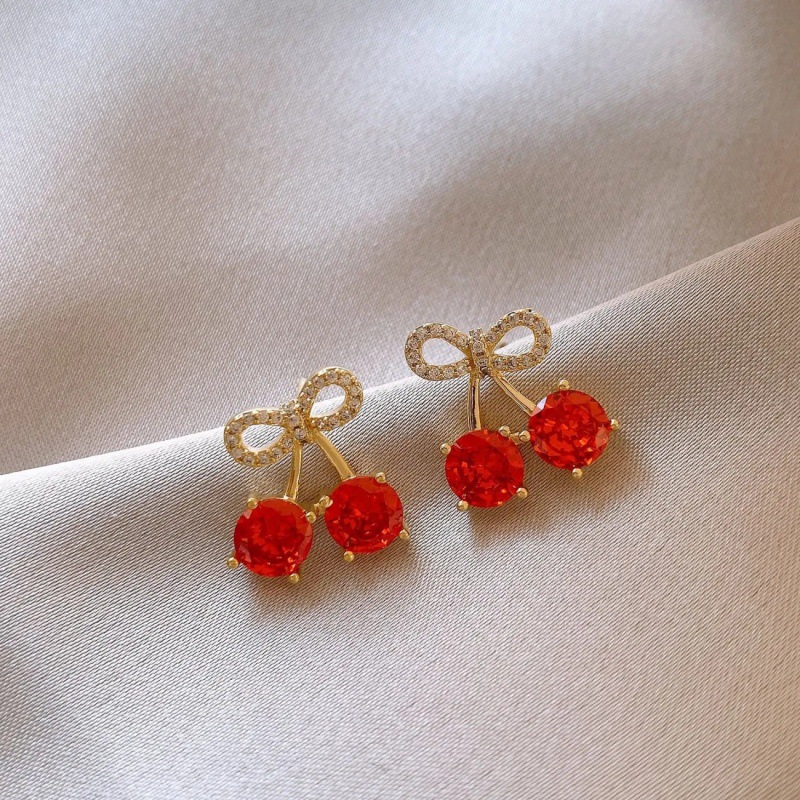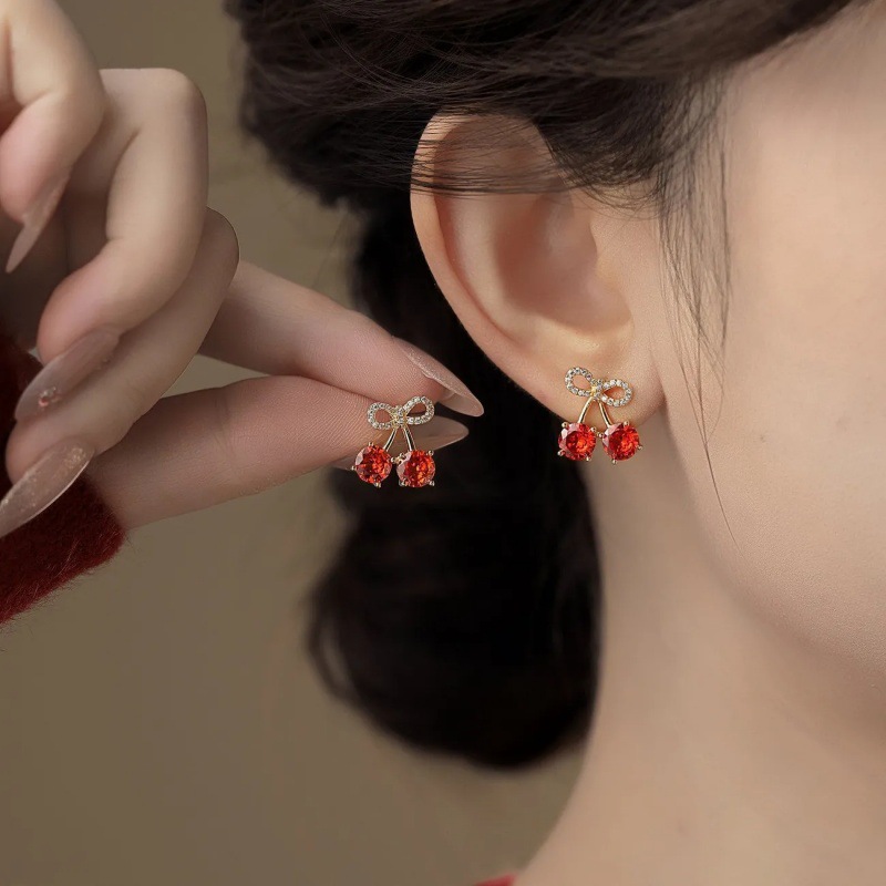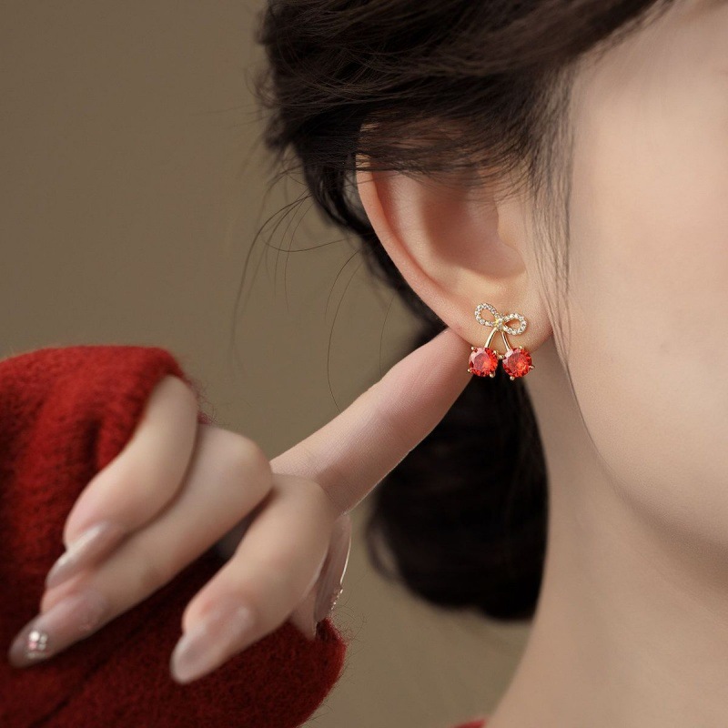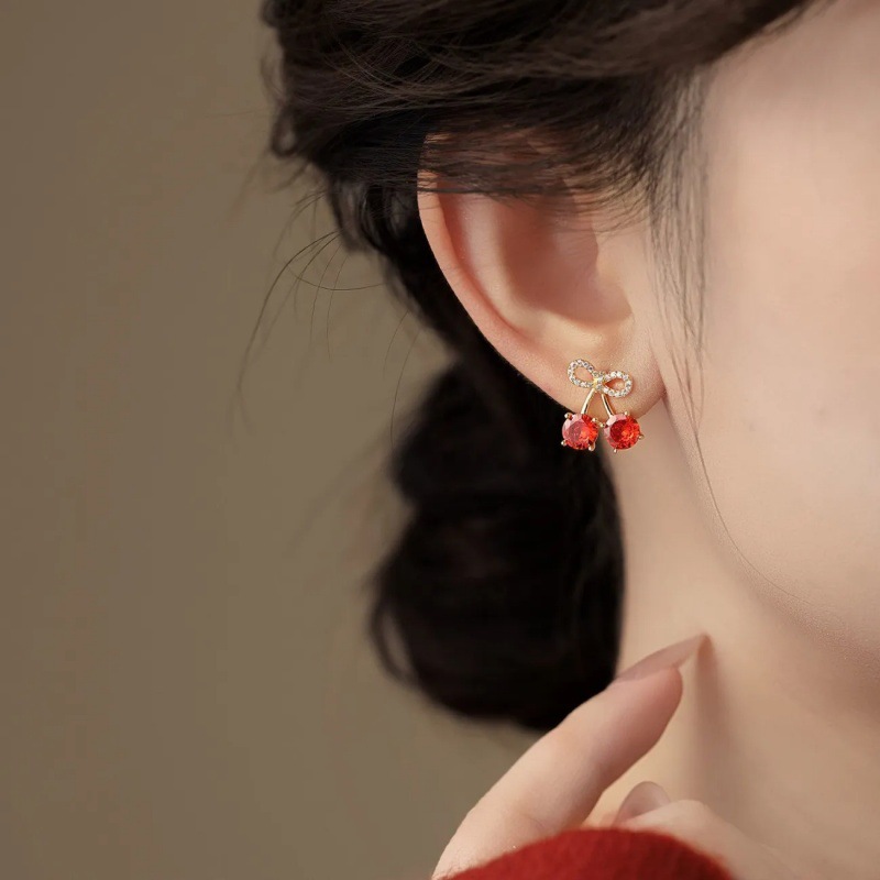 红色水钻蝴蝶结樱桃耳钉女轻奢高级感气质大气耳饰品独特漂亮耳环