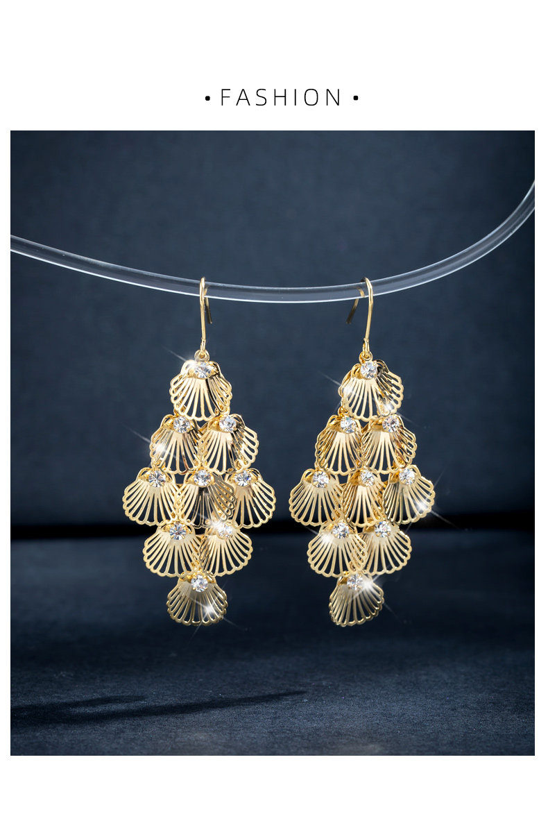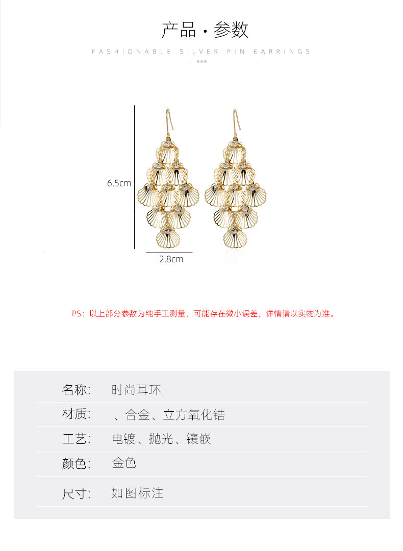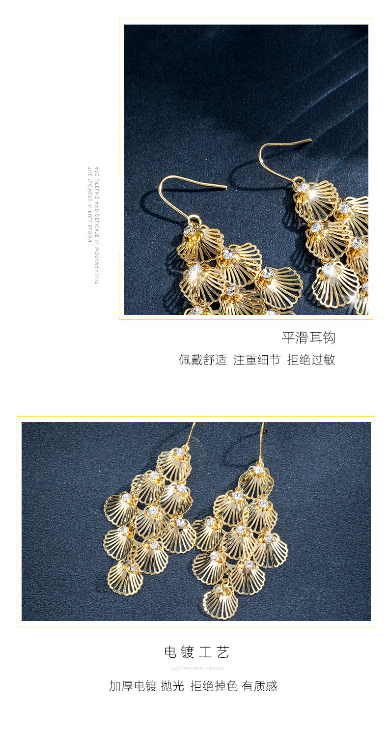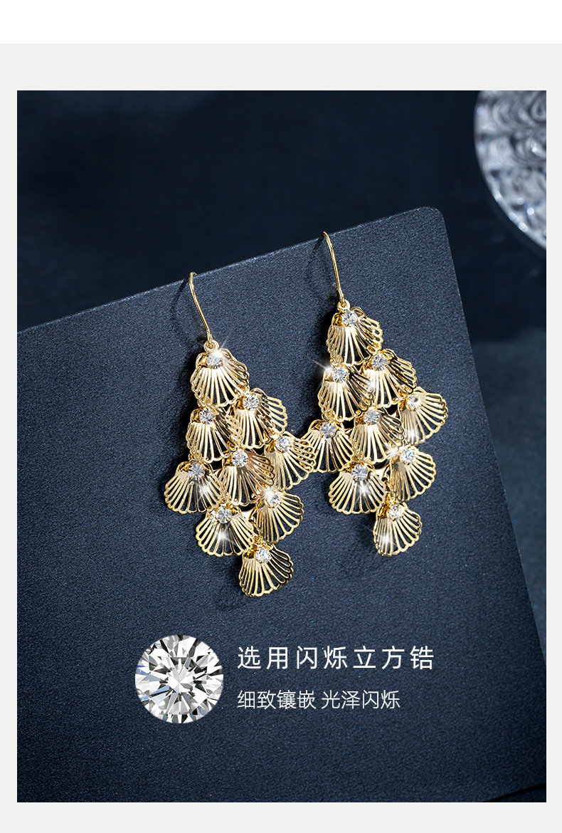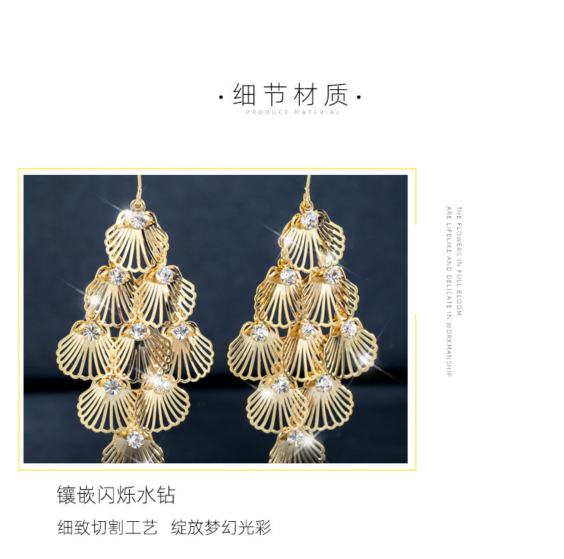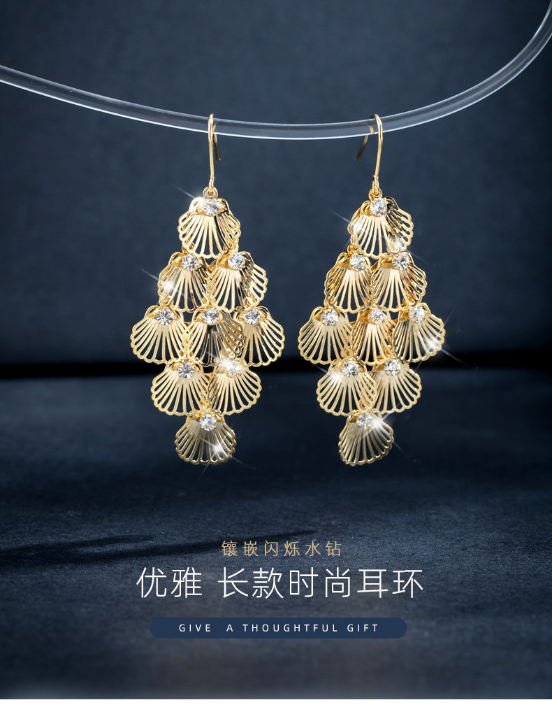 【真金电镀】 韩国镂空贝壳女耳环金色气质长款大气镶钻流苏耳饰耳钉