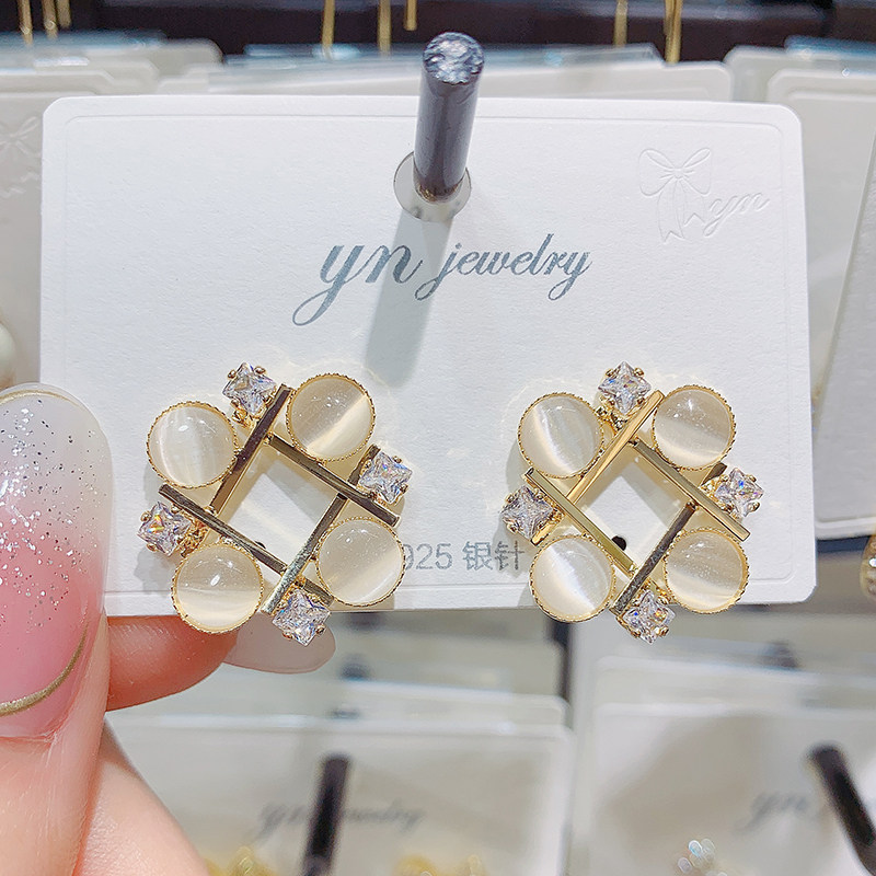 【真金电镀】 韩国东大门新款微镶锆石猫眼石耳钉方块几何气质时尚耳环