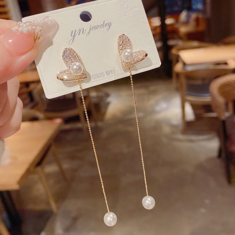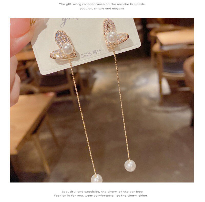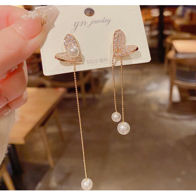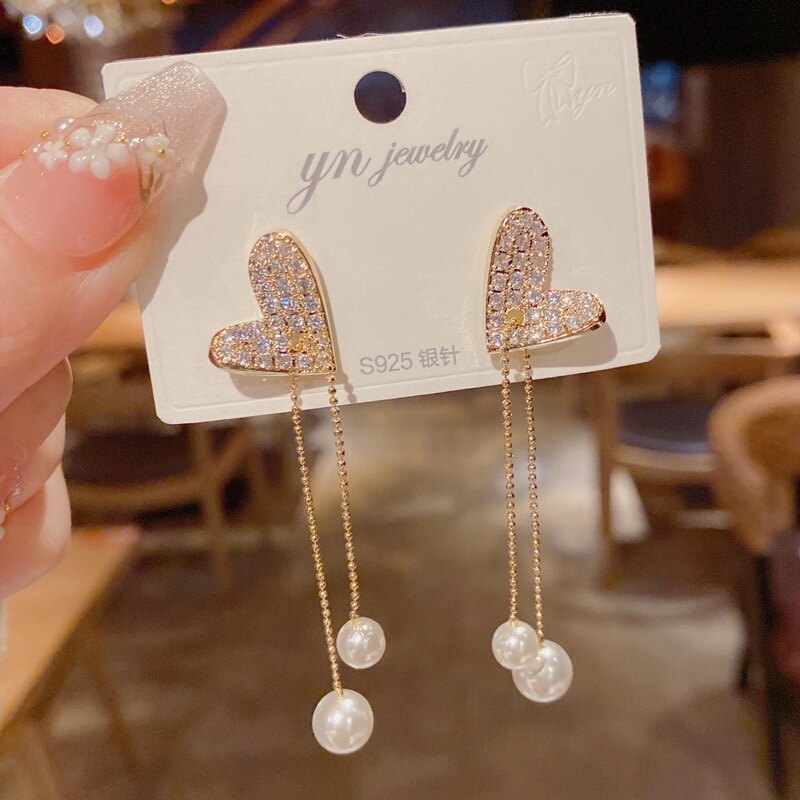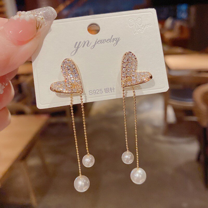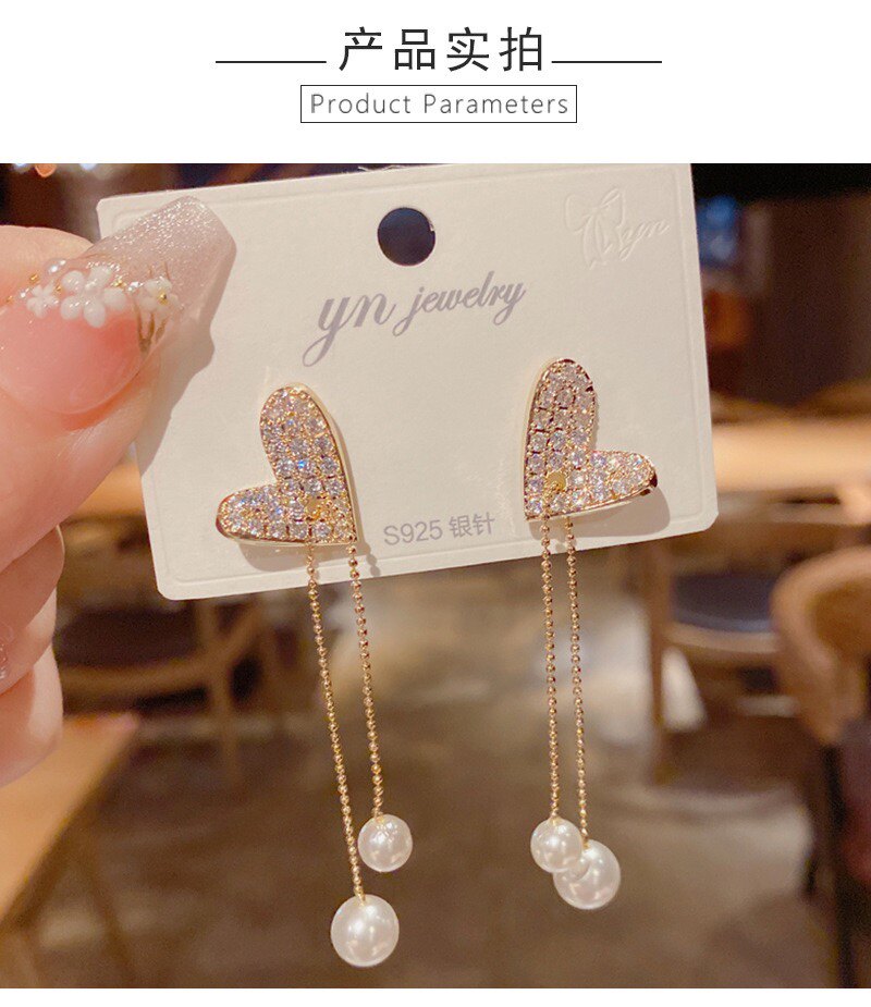 韩国网红爱心珍珠流苏2022新款潮气质圆脸显瘦百搭个性长耳钉耳坠