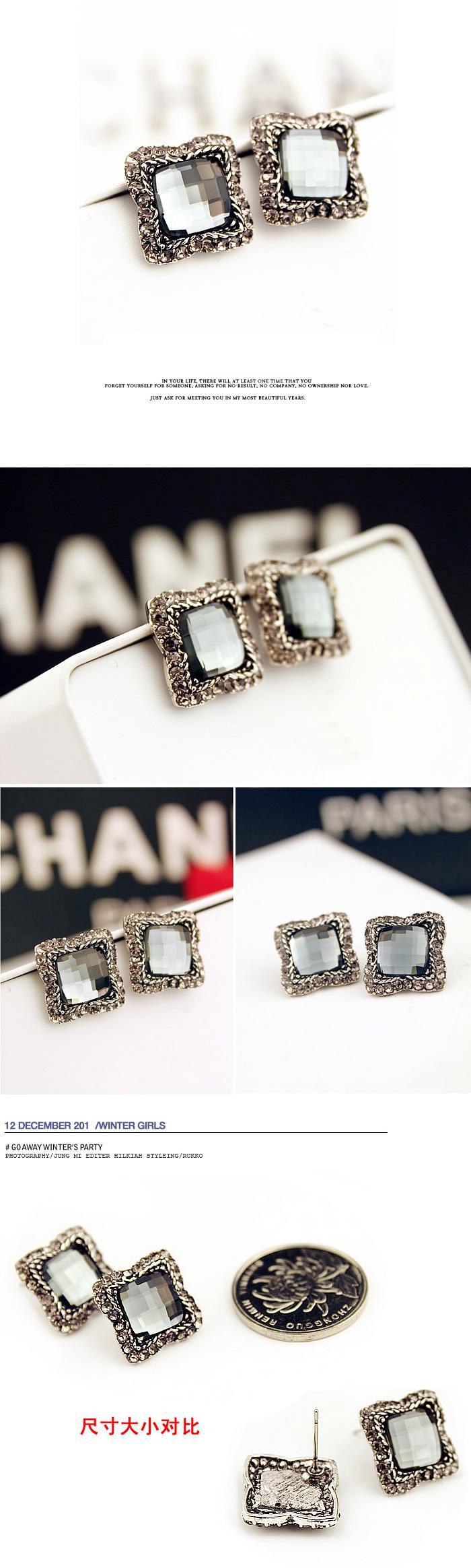 欧美时尚百搭奢华复古玻璃正方形水晶耳钉水钻耳环耳饰